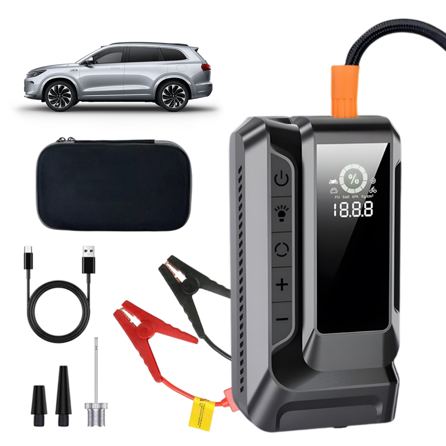 - 1. Екстрене джерело завантаження автомобіля Q16 оснащений ефективним пристроєм для аварійного запуску автомобіля з інтенсивністю 1200 А та 160 PSI повітряним компресором, що забезпечує здатність негайно запустити машину та надути шини. Вам більше не доведеться чекати допомоги або шукати найближчу АЗС, щоб надути шини. Завдяки побудованому монітору ви можете легко контролювати тиск і завжди бути впевненим, що повітря належним чином надута.