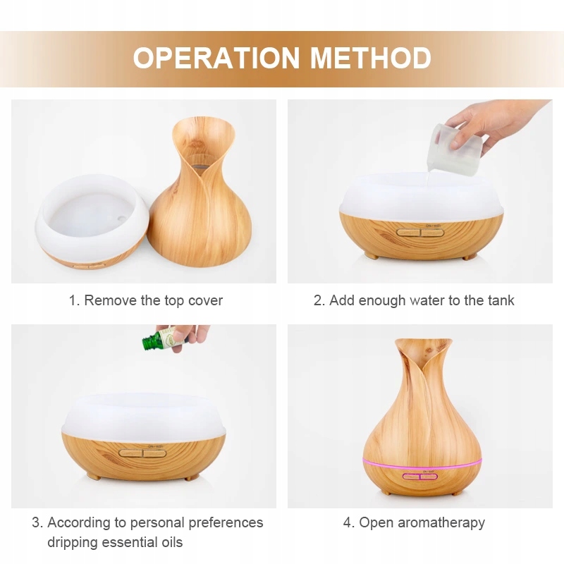 Видаліть верхню частину дифузора, додайте достатню кількість води та кілька крапель сутності аромату відповідно до власних уподобань, натисніть кнопку ON, підключіть дифузор до Wi -Fi та контролю за допомогою Smart Life / Tuya Smart додатка. Ви можете підключити дифузор до Amazon Alexa / Google Home та використовувати голос для зручного контролю інтелектуального дифузера, включаючи кольори, таймер, налаштування туману та інші функції.