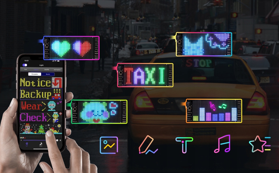 ✅ Динамічна конструкція DIY DIY】: Удосконалюйте свій автомобіль за допомогою нашого барвистого, захищаючого очі, м'якого екрана з програмованим та гнучким світлодіодним дисплеєм. Завдяки функції "Зробіть", ви можете адаптувати свої око -привернення графіки та повідомлення до особистого стилю