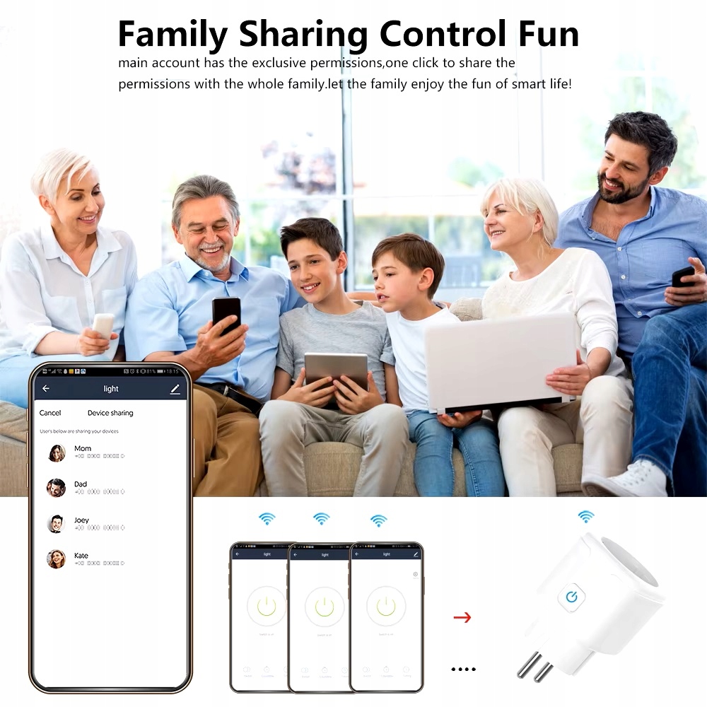 Інтелектуальна Wi-Fi розетка дозволяє вам керувати ним завдяки можливість підключення до мережі Інтернет побутової техніки за допомогою мобільного телефону або планшета з встановленим спеціальним додатком. Продукт забезпечує двосторонній зворотний зв’язок у реальному часі та дозволяє використовувати функції голосового керування.