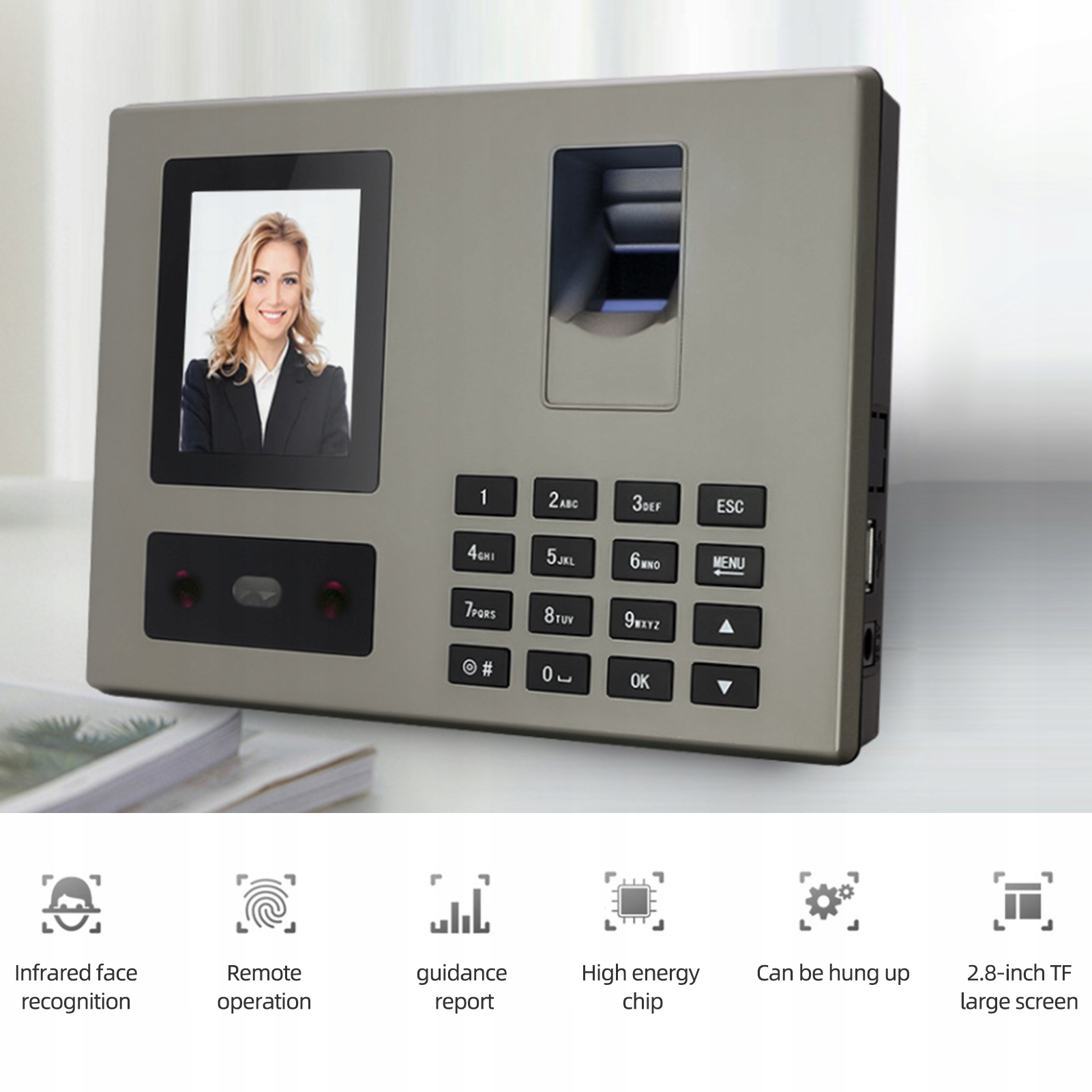 - ♦ Екран TFT з високою роздільною здатністю: оснащений 2,8-дюймовим кольоровим екраном TFT, ця машина забезпечує чіткий та жвавий дисплей, завдяки якому легко навігація та експлуатація. Записи обличчя, 1500 записів відбитків пальців та 500 записів паролів, ця машина може задовольнити потреби великих організацій. Він також має можливість зберігати до 100 000 записів транзакцій.
