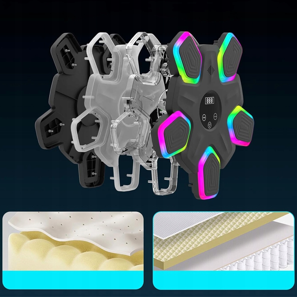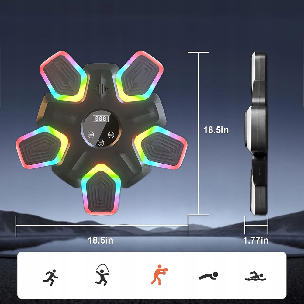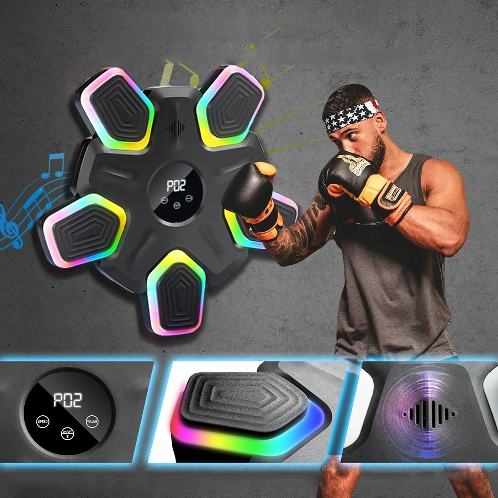 Ця інтелектуальна машина для музичного боксу оснащена вдосконаленим динаміком і світлодіодними світловими ефектами, які активуються, коли влучено в ціль. Підтримує з’єднання Bluetooth. Насолоджуйтесь улюбленою музикою, займайтеся боксом, дотримуючись ритму, покращуйте свою гнучкість, координацію та час реакції. Зніміть стрес і зробіть своє тренування повним енергії