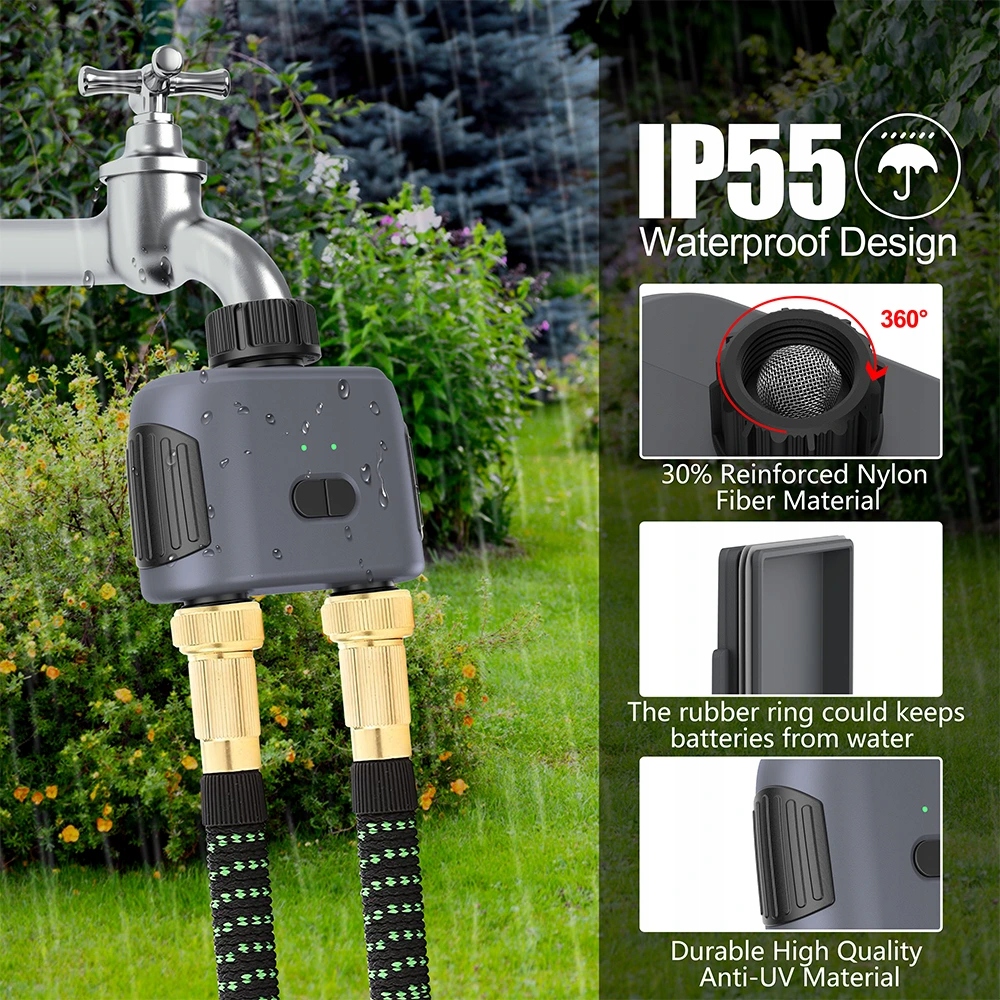 зрошення можна встановити щохвилини і вибирати частоту від 1 до 24 годин або циклів від 1 до 7 днів. Функція затримки дощу дозволяє затримати зрошення до 7 днів , допомагаючи врятувати воду в дощові дні. Крім того, завдяки голосовому контролю через Google Home та Amazon Echo, ви можете керувати клапаном, не дістаючись до телефону.