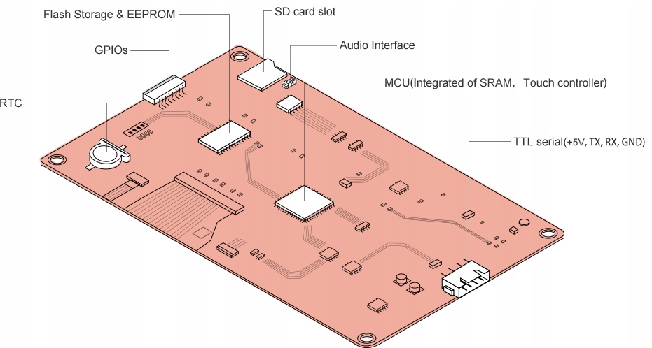 Керування дисплеєм здійснюється через послідовну шину UART. Дисплей рекомендовано для Arduino, Raspberry PI та систем із мікроконтролерами ESP8266.