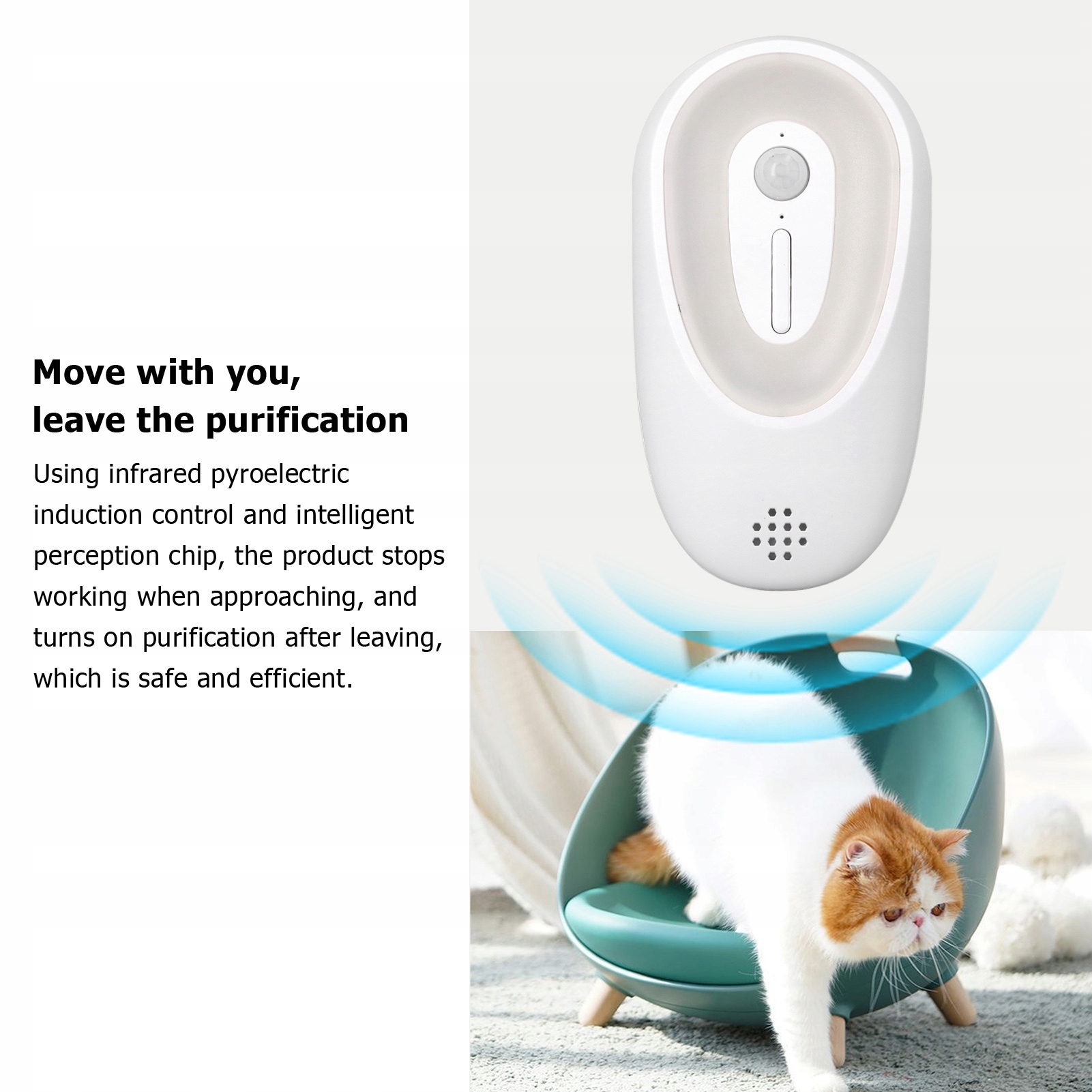 3. Очищення під час виходу: за допомогою інфрачервоного піроелектричного індукційного контролю та інтелектуального чіпа сприйняття розумний очищувач запаху домашніх тварин припиняє працювати, коли наближається, і вмикає очищення, коли відходить, що є безпечним і ефективним.