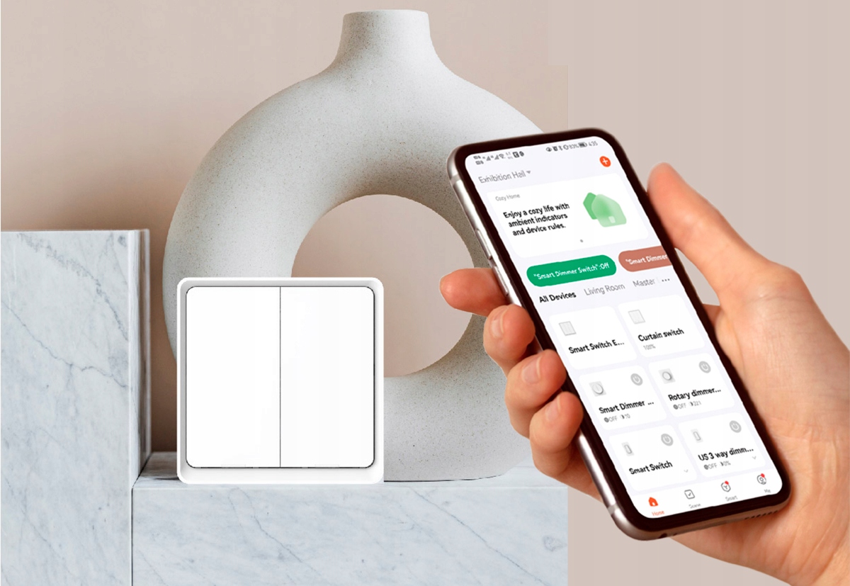 Інтелектуальний комутатор від MODEMIX. Зв'язок з комутатором відбувається через Wi-FI за допомогою програми Tuya Smart. Прилад монтується впритул. Розміри вимикача 86 х 86 х 37 мм. Дальність зв’язку приблизно 20 м.