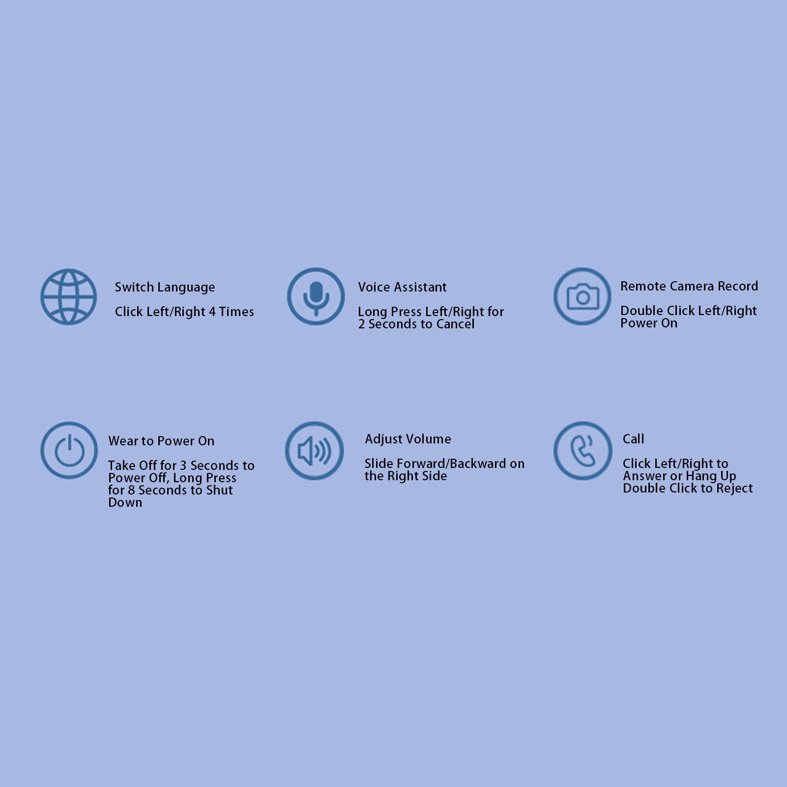 1. З’єднання Bluetooth: насолоджуйтесь функціями бездротового відтворення музики та телефонних дзвінків, що дозволяє слухати улюблені мелодії та відповідати на дзвінки будь-де та будь-де за допомогою наших розумних окулярів.
