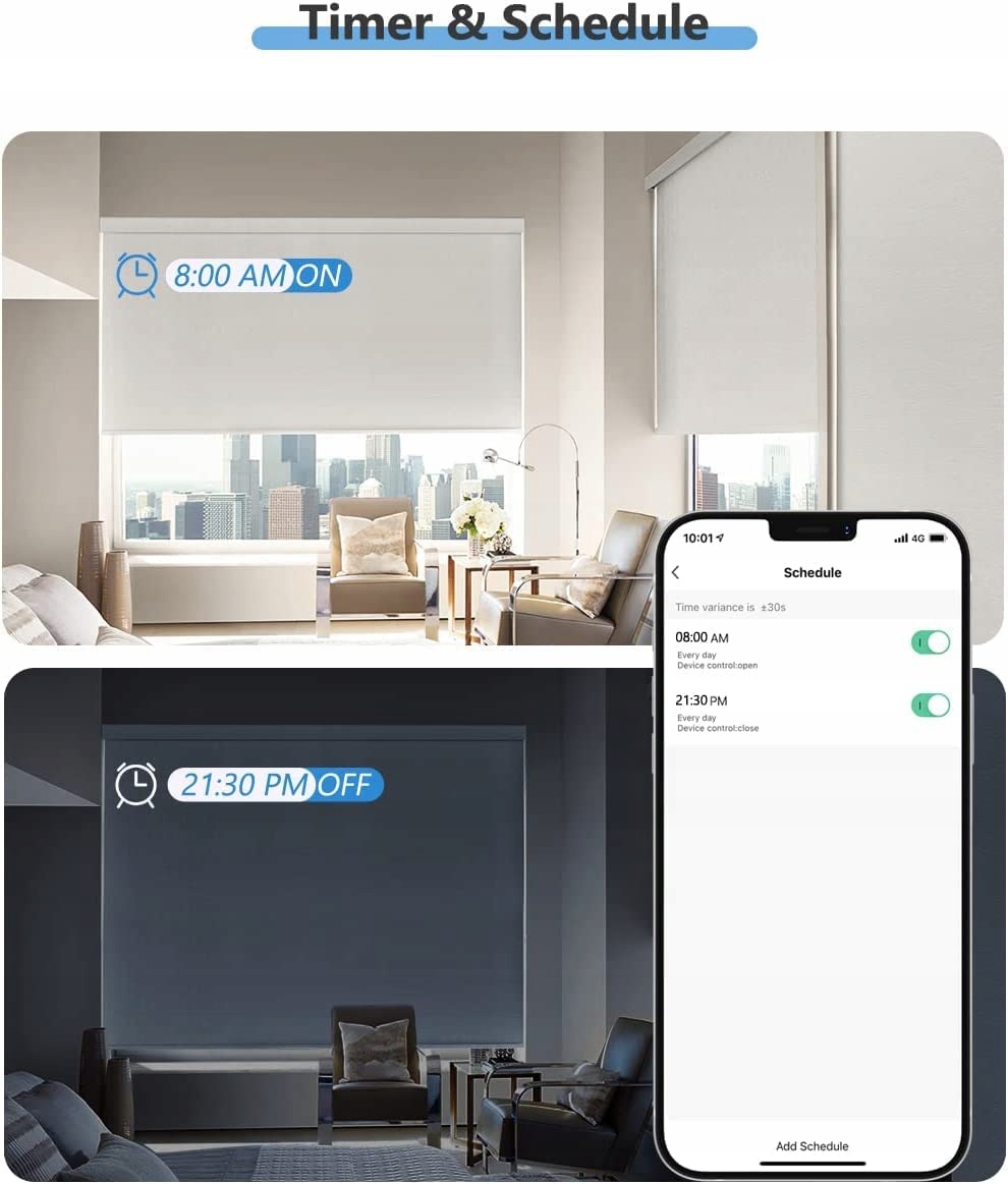 - Керування голосом – сумісний із Amazon Alexa та Google Home. Просто скажіть «Alxea, встанови рулонні штори на 60%» або «Alexa, вимкни жалюзі/пауза», щоб насолоджуватися спокійним життям.