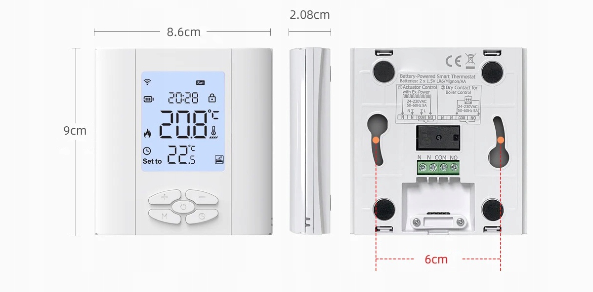 Термостат може замінити старі батарейні термостати, які мають лише кабелі, підключені, наприклад, до печі. Не потребує розміщення в ящику.