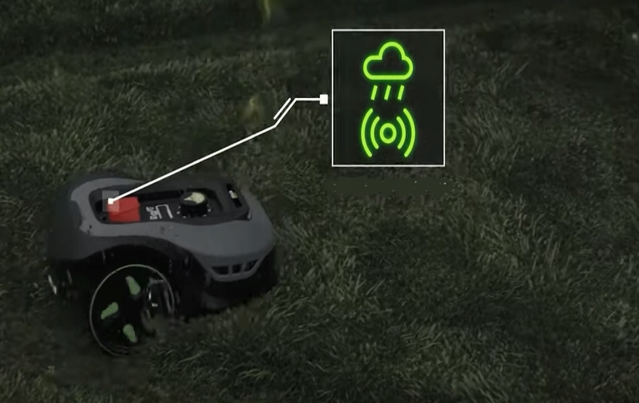 - Датчик дощу b> Встановлений у косильний робот дозволяє йому розпізнавати дощ і автоматично повертатися до зарядної станції. Там він зачекає, поки газон висохне, а потім знову почне косити. Функцію затримки косіння можна регулювати незалежно від програми або панелі керування на роботі