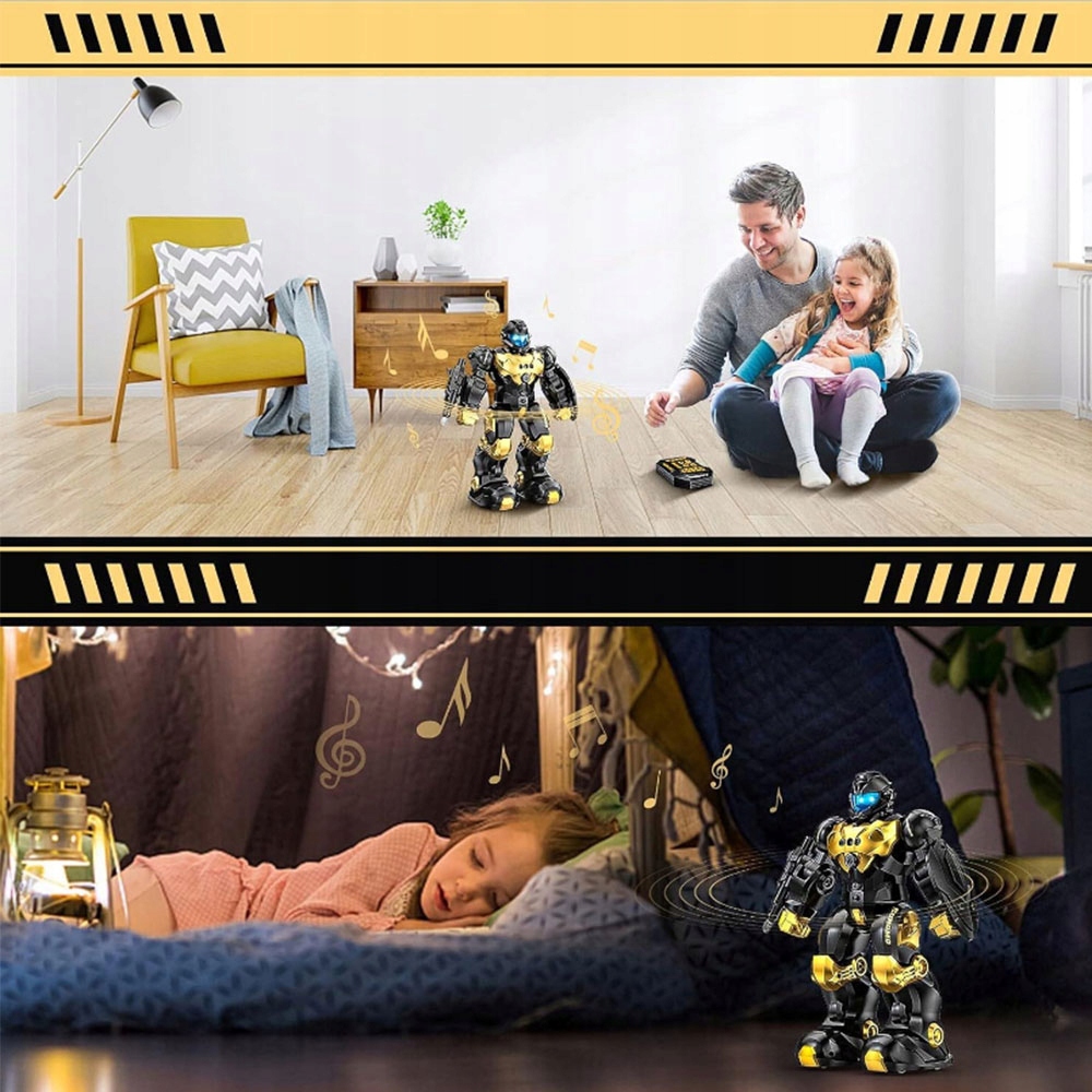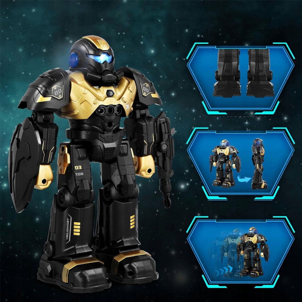 Робот із дистанційним керуванням оснащено дистанційним керуванням, щитом, пістолетом і кулями. Робот більший за інших роботів і імітує звук кулемета. Отже, якщо обидва діти купують цього робота, вони зможуть влаштувати захоплюючий бій! Робот також має світлодіодні очі, які дуже прохолодні вночі, і дітям дуже сподобається ця іграшка!