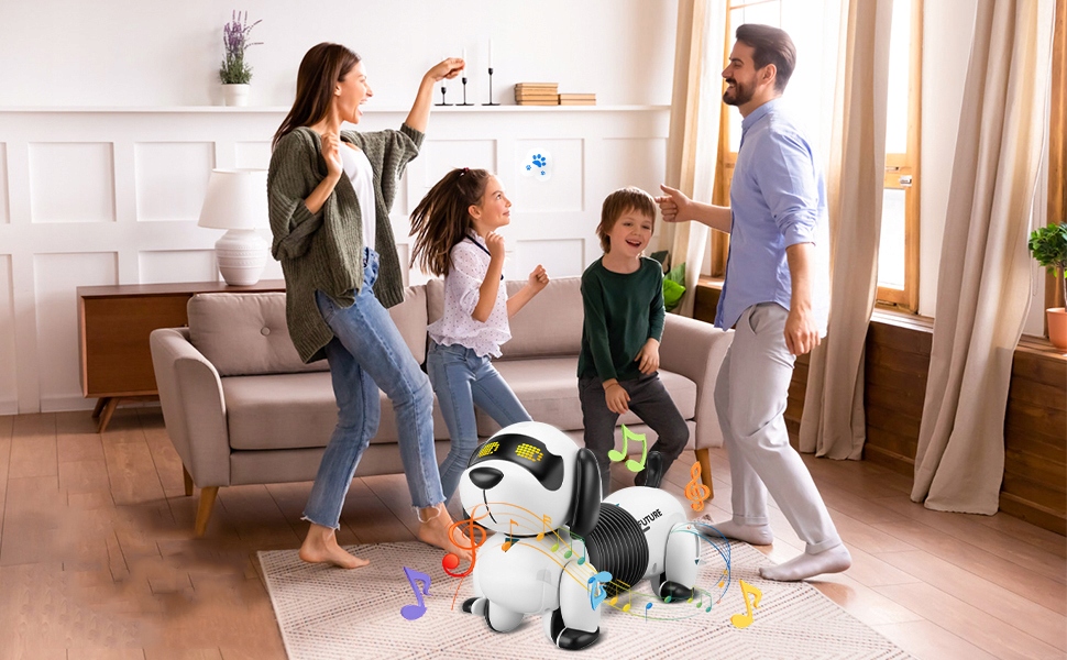 🦮 - Після натискання кнопки "Слідуйте за мною" на пульті дистанційного керування, собака -робот виявить ваше місцезнаходження та слідувати за вами на кожному кроці. Більше того, ви також можете змусити його танцювати та співати.