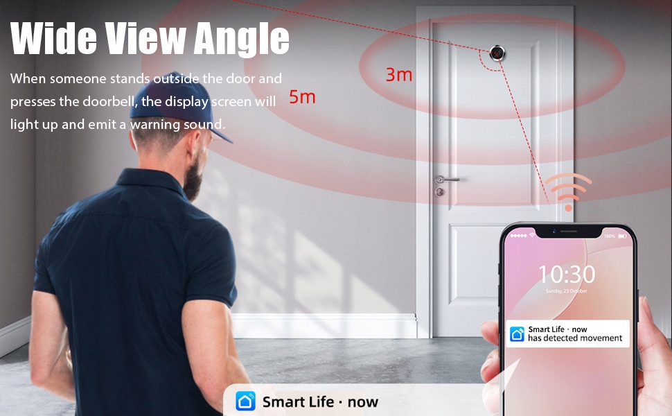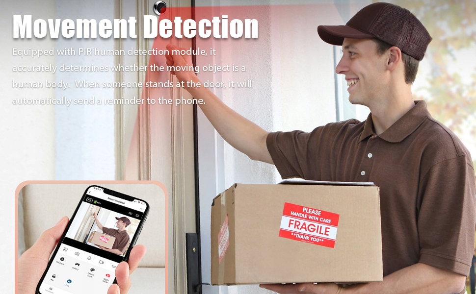 ДЕТЕКТОР РУХУ: Оснащена модулем виявлення руху PIR, камера точно визначає, чи рухомий об'єкт є людиною. Коли хтось стоїть біля дверей, він автоматично надсилає нагадування на телефон.