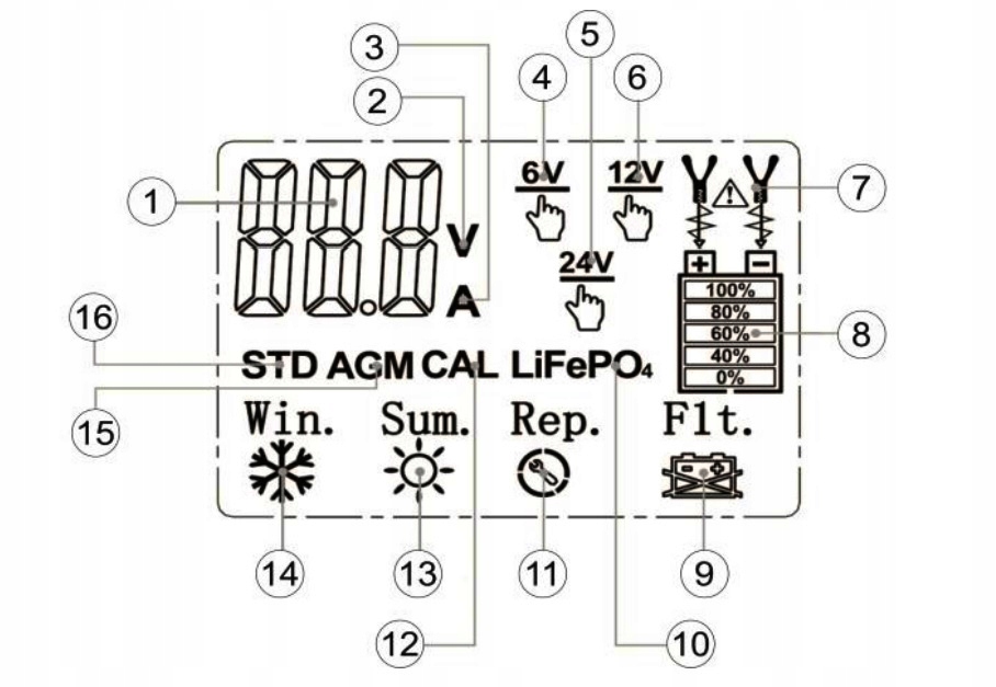 - Індикатори напруги батареї (6В/12В/24В) – повідомляють про вибрану напругу зарядного струму.< /li>
