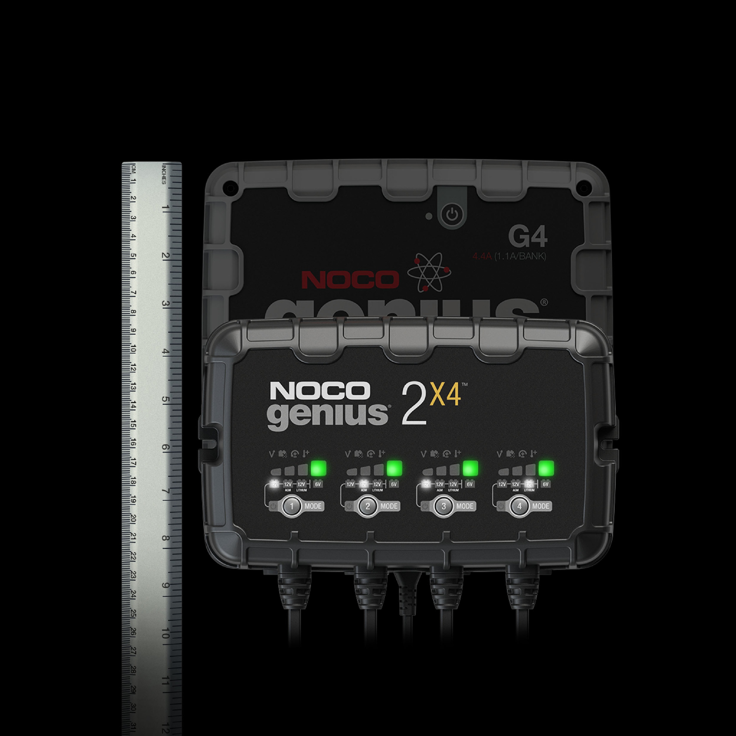 NOCO GENIUS2X4, 4 пристрої (4 зарядні пристрої в одному корпусі, здатні заряджати 4 акумулятори одночасно), 8 ампер (2A на кожен зарядний пристрій).
