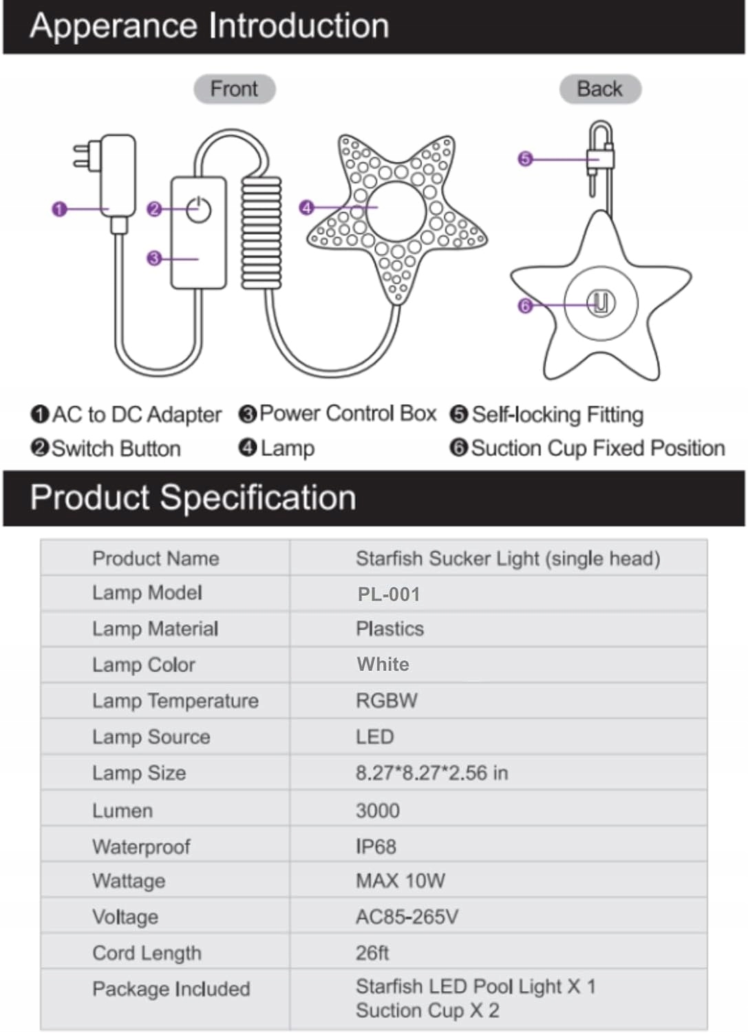 Інтелектуальний світлодіодний світильник для басейну у формі морської зірки