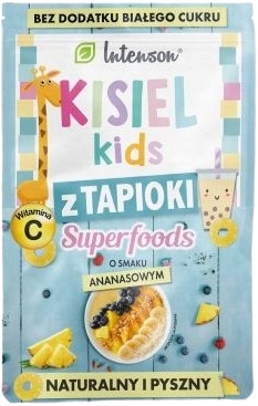 Kisiele KIDS - це натуральна версія популярного десерту. Він має простий склад, без жодних штучних добавок, а також має чудовий смак. Складається на основі тапіоки, яка є джерелом цінної енергії у двох смаках – полуниці та ананаса з додаванням цінних суперфудів. Полуничне желе містить ягоди годжі та екстракт ягід асаї з антиоксидантними властивостями, а ананасове желе містить баобаб, який має високий вміст вітаміну С. Желе не містить білого цукру та зобов’язане своєю солодкістю тростинному цукру.