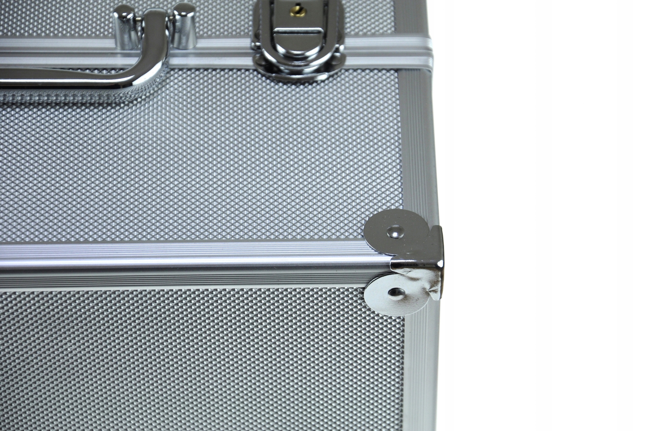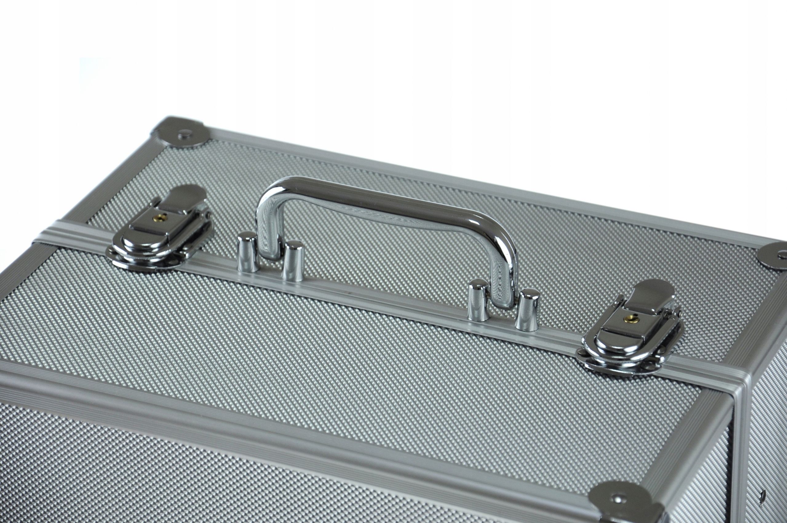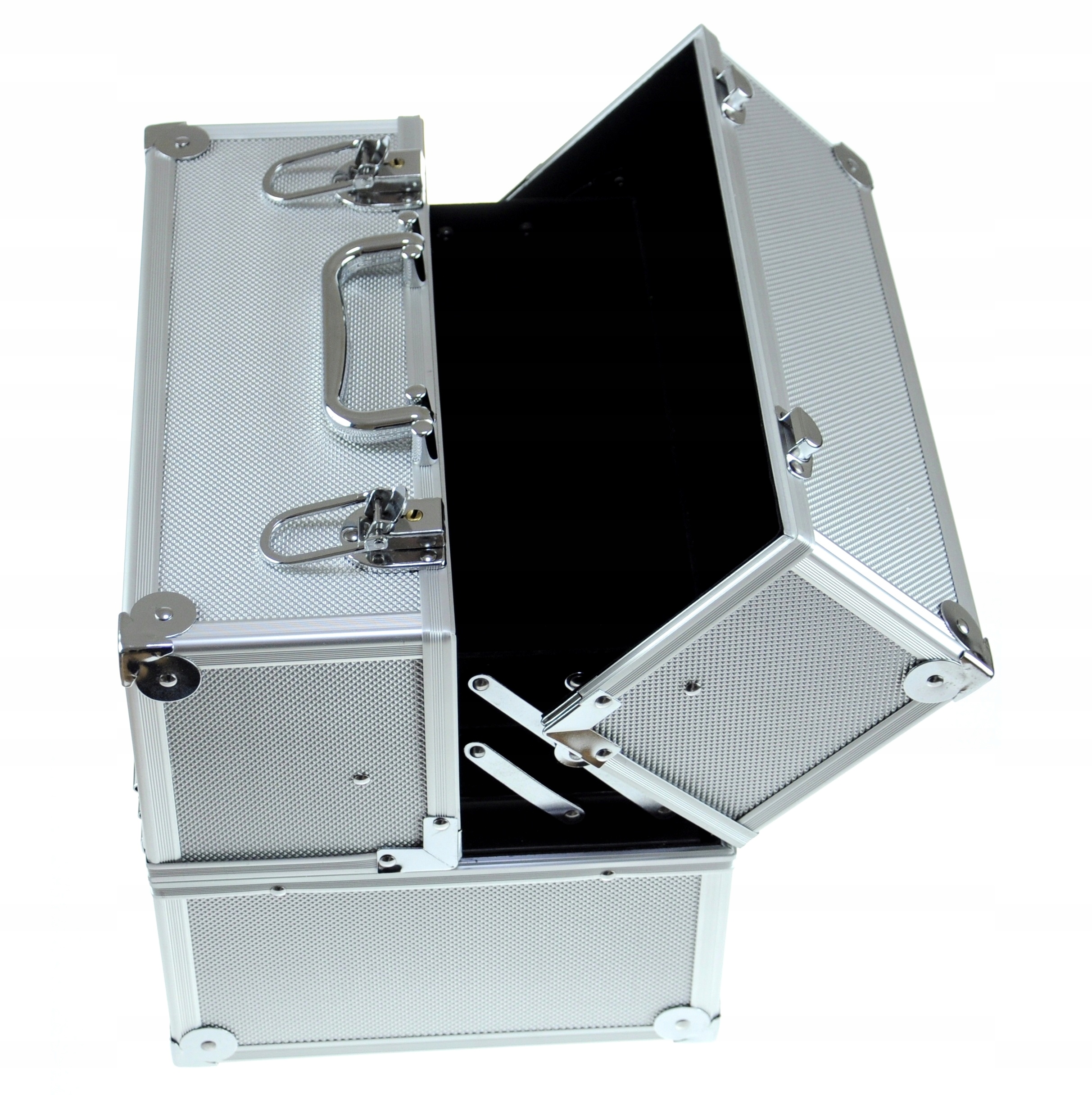 Косметичка Inter-Vion. Призначена для візажистів, косметологів, перукарів і для зберігання косметики вдома. Виготовляється з алюмінію, металу, пластику та синтетичних матеріалів. Металевий каркас забезпечує стійкість конструкції. Шорстка текстура стійка до подряпин і води. Чотири складані полиці та нижній контейнер дозволяють легко та практично сортувати косметику та аксесуари. Багажник відкривається з двох сторін. Салон обшитий чорним, матовим матеріалом. Корпус стійкий до погодних умов: дощ, сніг, град. Виріб має пластикову профільовану ручку. Весь закривається на пряжки та блискавку.Розміри в складеному вигляді: - Висота: 24,5 см- Довжина: 30 см- Ширина: 22 см.Вага: - 2120 g.