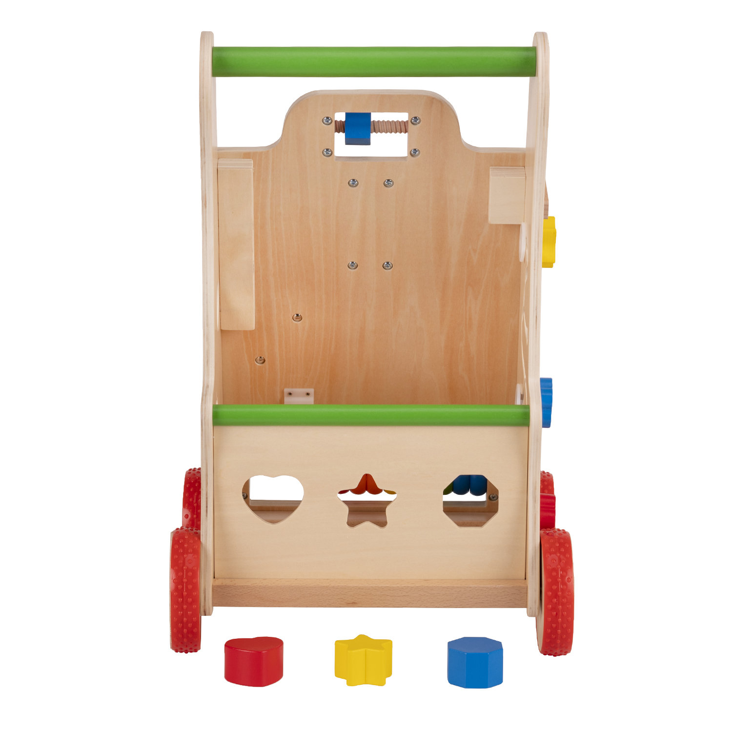 Ходунки - це іграшка, яка супроводжує дитину під час перших кроків, а також навчальний розважальний центр, який розвиває моторику дитини. Кожна зі стінок пушера має абсолютно різну функціональність і характер. Це дозволяє проводити дуже цікаву гру, яка ніколи не набридне та стимулюватиме розвиток малюка: рахівниця та тарілки, лабіринт, рухомі кульки та гвинтики, дзеркало та рухомий пазл. Ходунки також виконують функцію контейнера для іграшок, а завдяки сітці речі захищені від випадання. Має протиковзкі колеса. Іграшка виготовлена з сертифікованої високоякісної деревини, повністю безпечна, покрита нетоксичною фарбою. Варіант з регульованою ручкою дозволяє підлаштувати ходунки під зріст дитини.