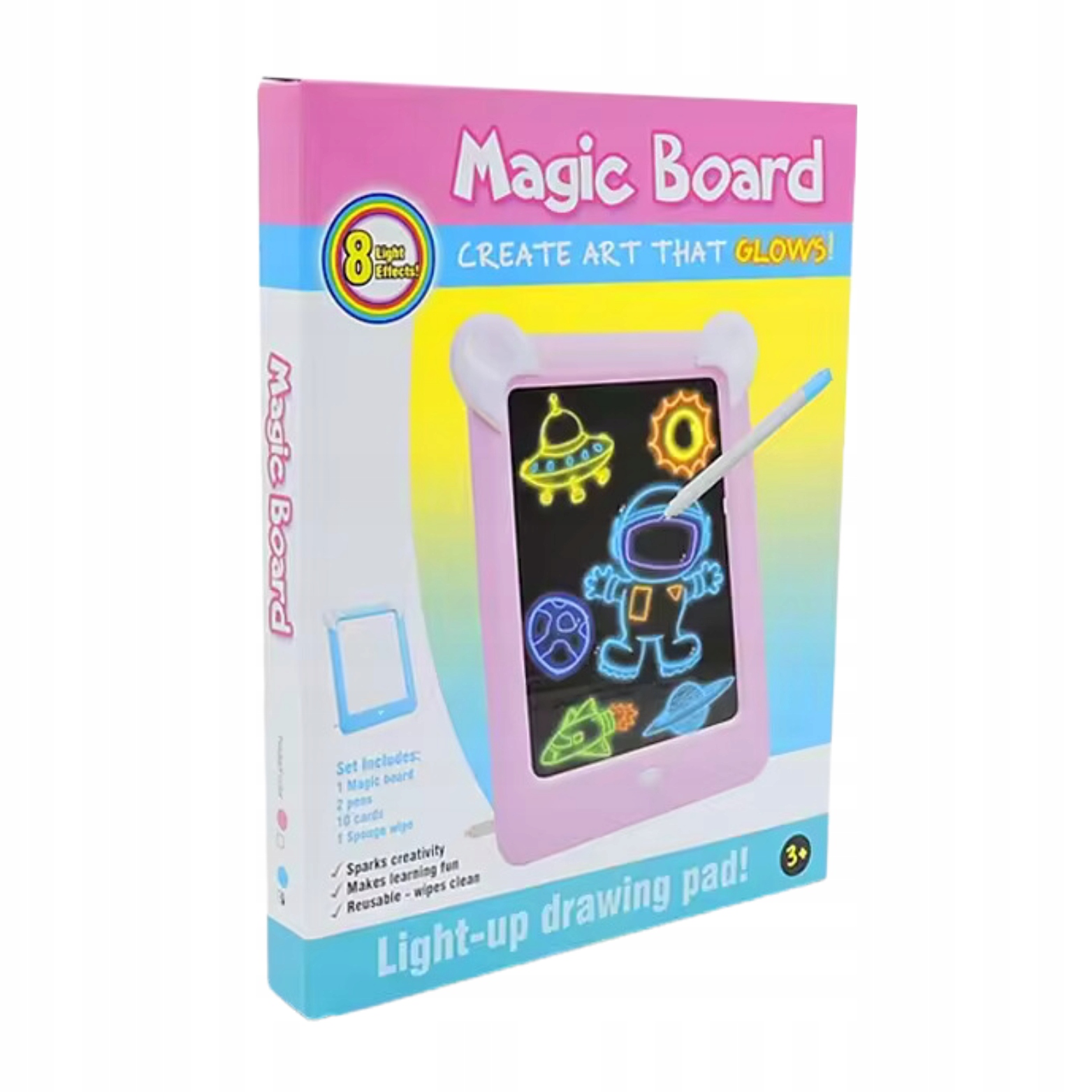 Набір для малювання на дошці — це чудова іграшка, яка надихає дітей на творче самовираження та експерименти з мистецтвом. У набір входить прозора дошка та картки для малювання, які дозволять дітям створювати чудові картини простим та інноваційним способом. За допомогою спеціального матеріалу вони можуть стерти малюнок і почати малювати з нуля. Найкращого ефекту можна досягти, використовуючи чорний папір як фон або ввечері, коли темно, оскільки малюнок можна підсвітити!