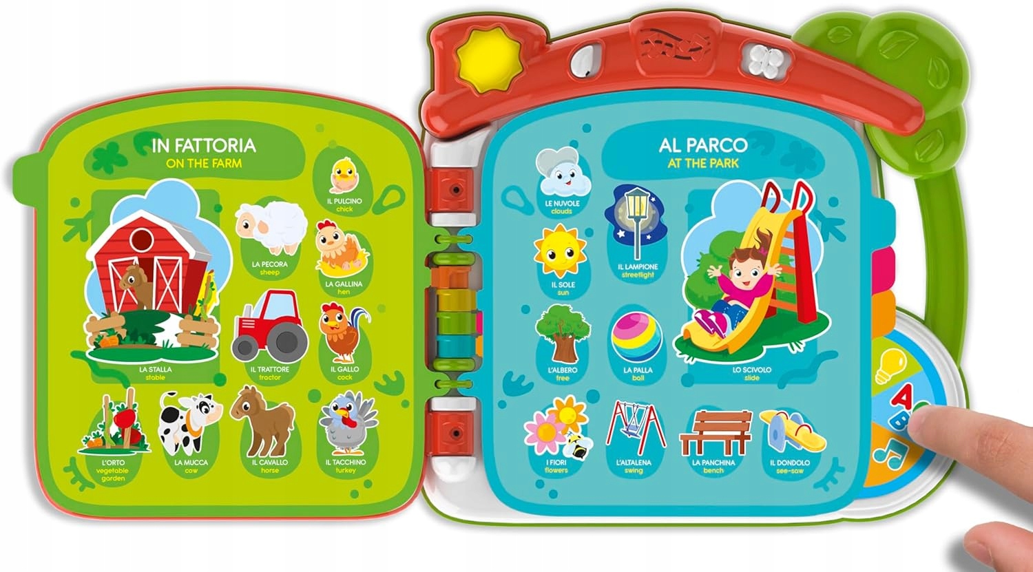 Книга розмовляє двома мовами - італійською та англійською, допомагаючи дитині розвивати мовні навички з раннього віку 🧠💡. Завдяки пісням, римам і звуковим ефектам навчання стає радісною пригодою 🎶🌈.