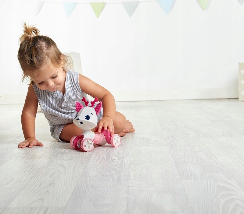 - Точні рухи - різноманітні функції іграшки спонукають дитину використовувати руки та пальці різними способами, тим самим зміцнюючи дрібні м’язи та розвиваючи точні рухи. - Рухи всього тіла - іграшка-каталка заохочує дітей проводити більше часу на животику і пізніше відкривати власну здатність рухатися та повзати. - Уява та креативність - гнучке тіло, голова, що обертається, і рухи іграшки роблять оленя іншим, що надихне дитячу уяву та творчість. - Асоціації - діти досліджують різні можливості іграшки та вчаться працювати з різними її частинами. Тіло у формі гармошки відіграє важливу роль у цьому процесі, навчаючи малюка, який росте, як згинання тіла змінює напрямок, у якому котиться іграшка.