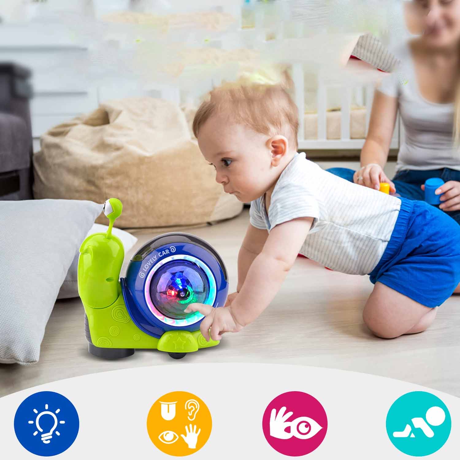 ✔ колеса для підлоги та килимів: На дні є універсальне коло, завдяки якому ця іграшка для повзання для дитини може повзати на підлозі та килимах, а також змінити маршрут, коли він натрапляє на акцію. Він повільно рухається по маленькому колі, щоб дитина могла йти в ногу з ним.