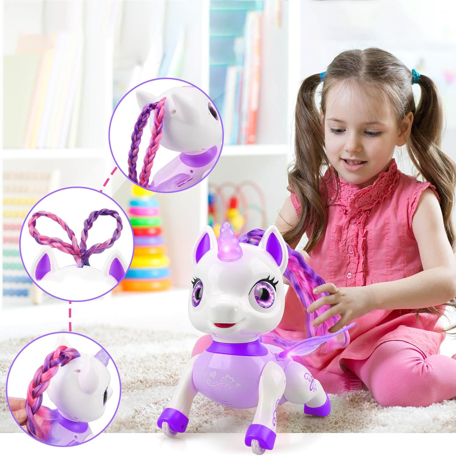 -лу задоволення вашої дитини завдяки роботовому одиниці, частині нашої серії електронних іграшок для тварин. Він оснащений гребінцем, завдяки тому, що дівчата можуть розчісувати та плести волосся єдинорога. Пілот дозволяє єдинорогу професійно уникати перешкод, надихаючи творчість та логічне мислення вашої дитини. Цей інтерактивний досвід поєднує творчу забаву з музикою та робототехнікою.