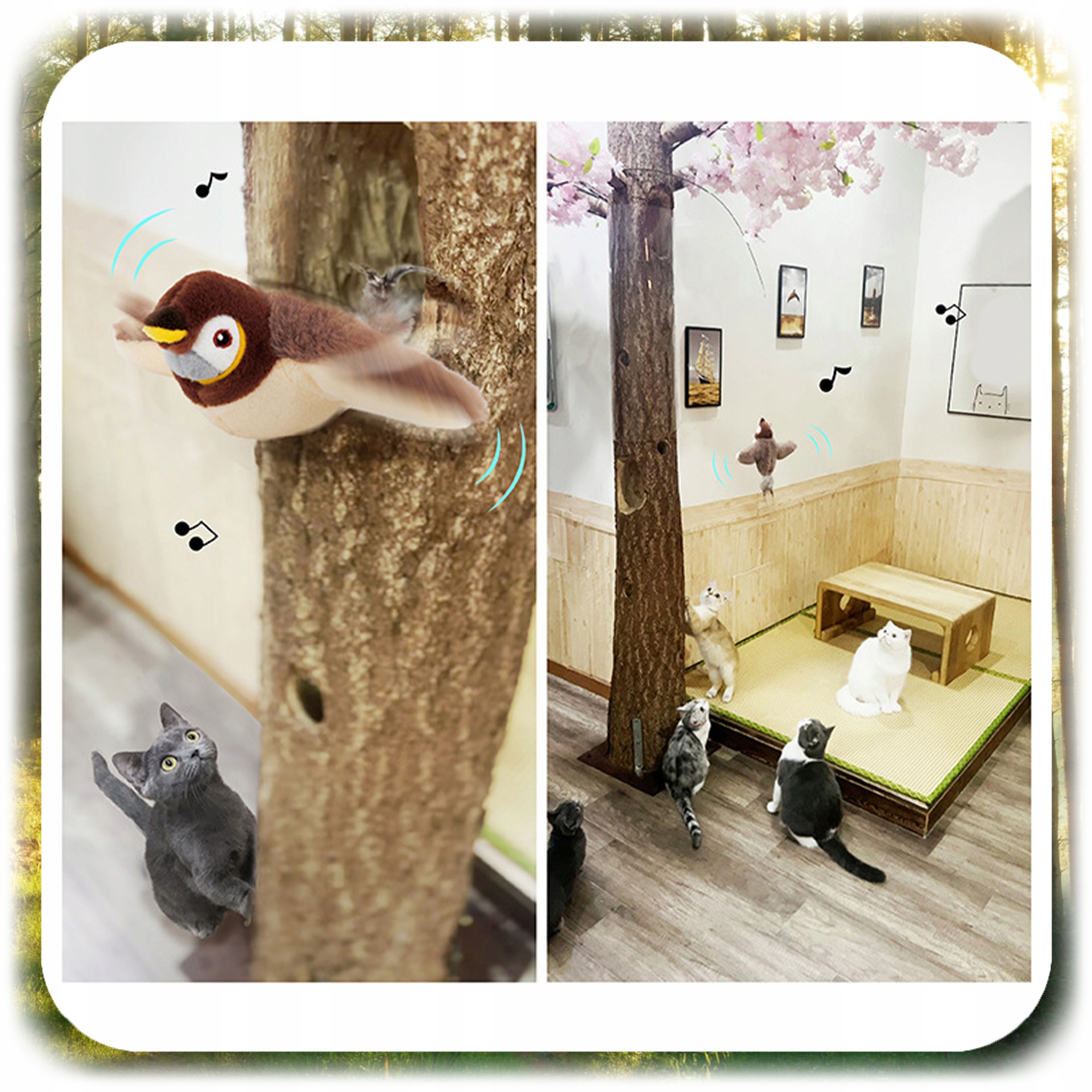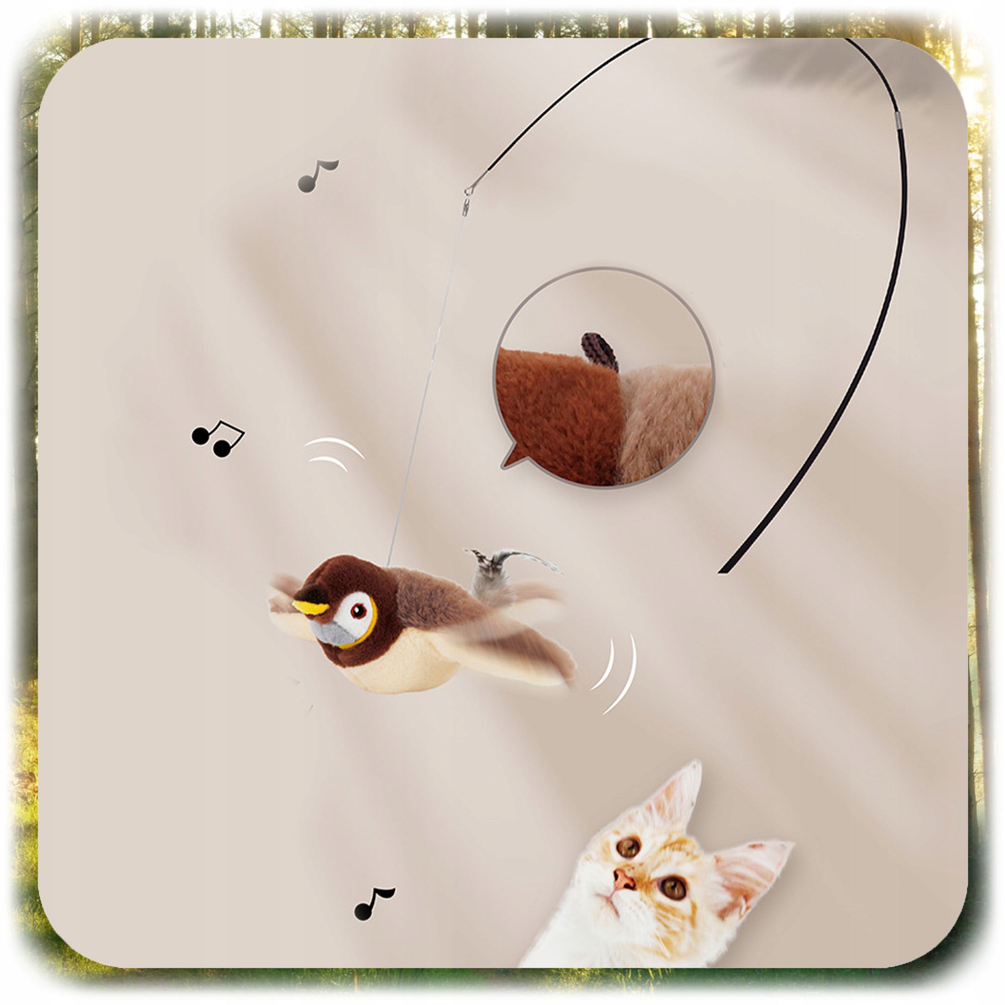 Після натискання або переміщення іграшка видає звуки, що нагадують спів або двічі птаха, що автоматично привертає увагу кішки та заохочує його грати. Крила