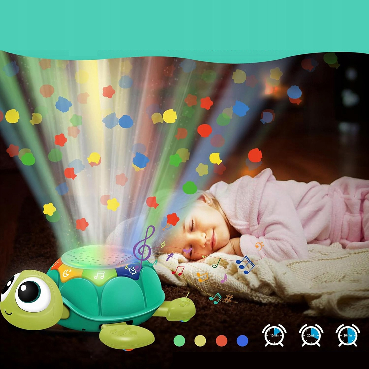 - Ця іграшка у формі черепахи освітлює кольорове зоряне небо на стіні чи стелі.