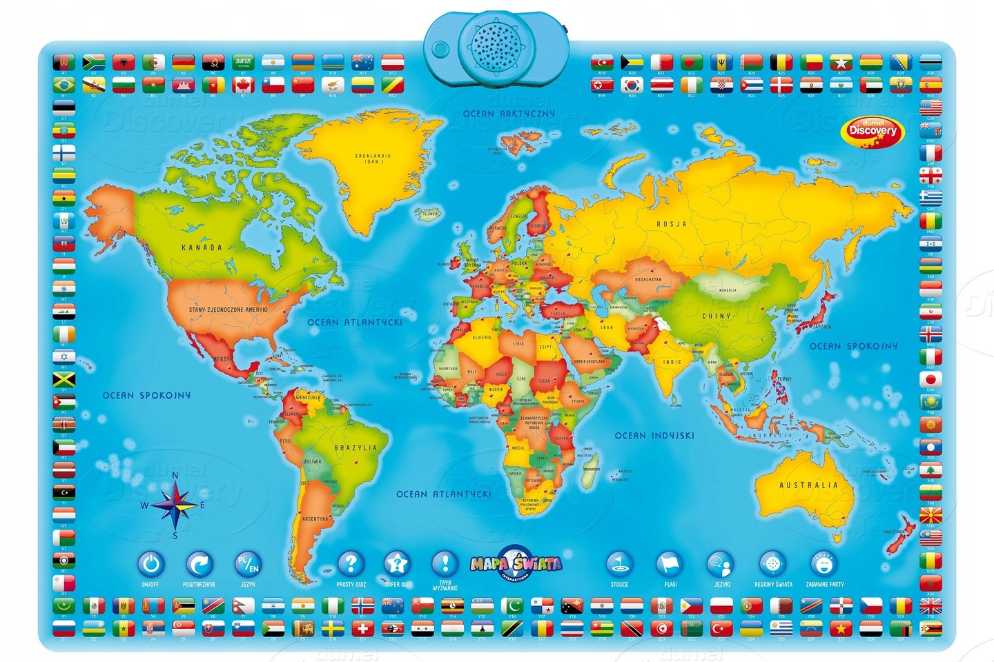 Завдяки інноваційній карті діти мають доступ до широких знань щодо 78 країн. Вони дізнаються про столиці, прапори та мови, якими розмовляють мешканці та різноманітні цікаві факти.