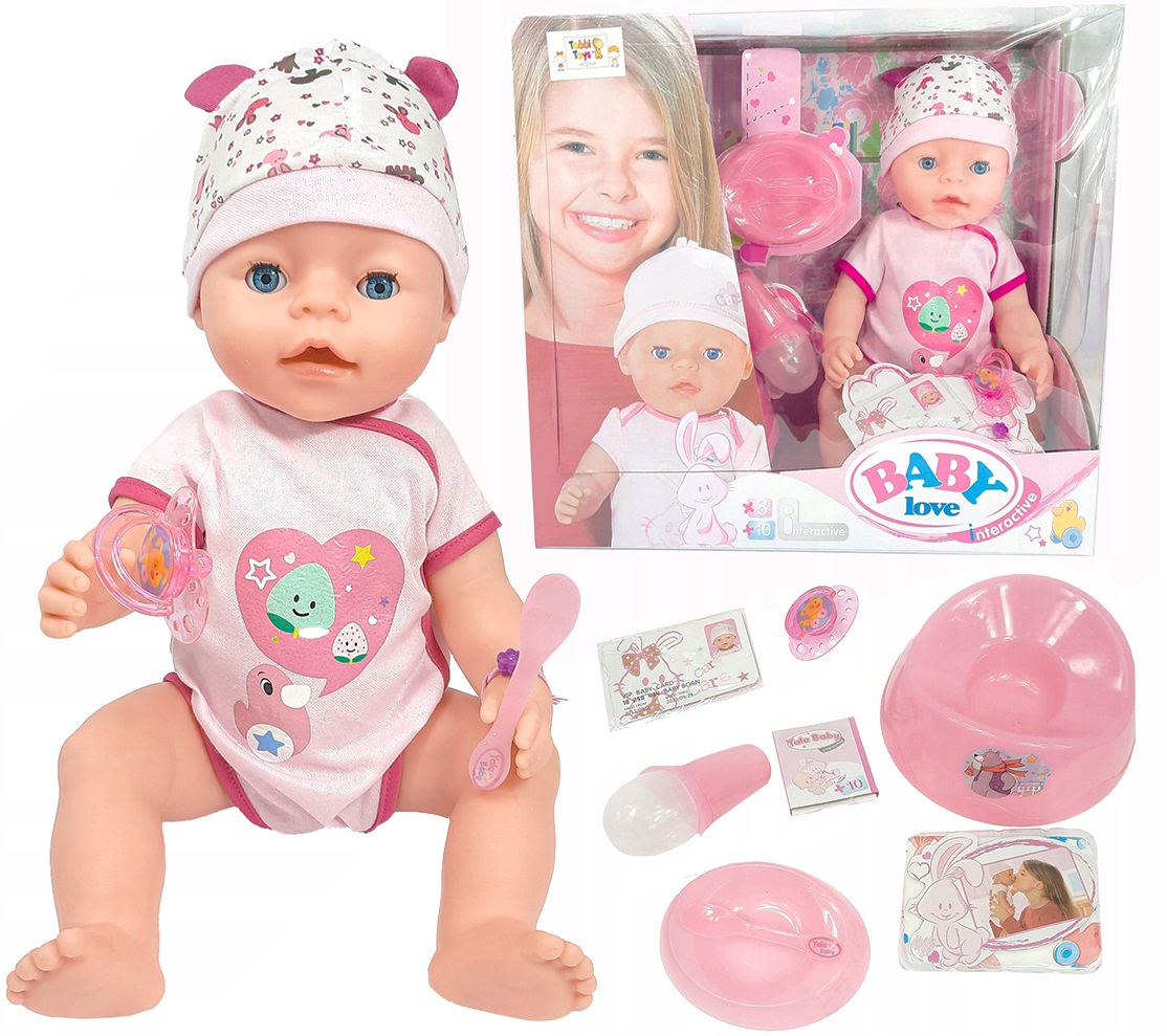 Іграшка виконана естетично з увагою до деталей. Рухомі очі закриваються після того, як її поклали спати. Маленький вихователь може погодувати свою ляльку, посадити її на горщик пописати чи подрімати.