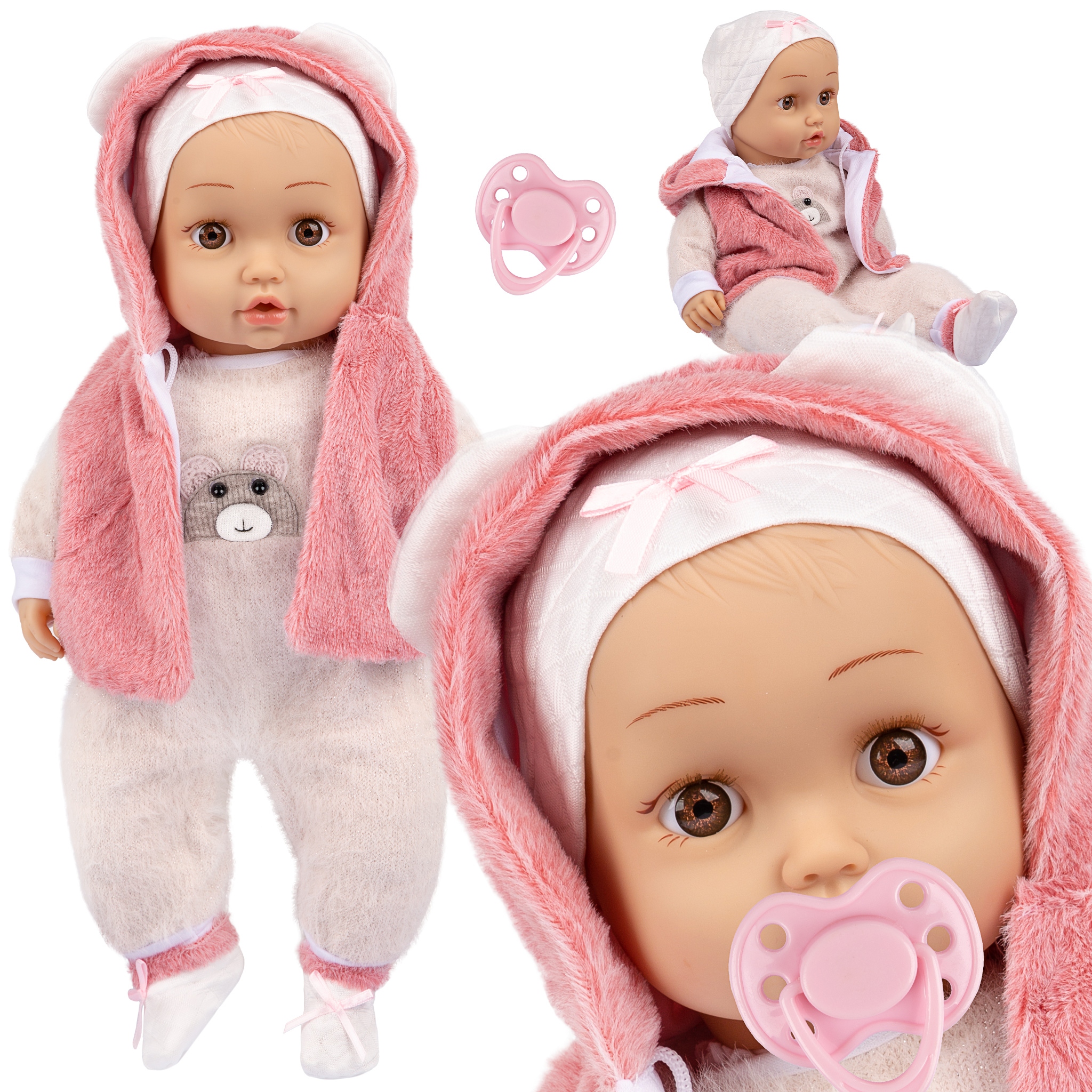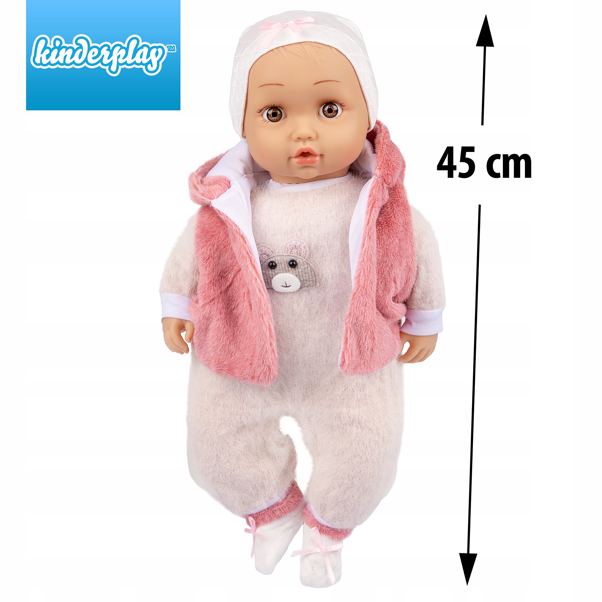 Лялька дитина має веселе, миле обличчя та великі очі з веселим обличчям . Вона виглядає як справжня дитина одягнена в м'який одяг. У набір входить: лялька висотою 45 см (розмовляє і співає польською), соска (магнітна), шапочка, безрукавка з капюшоном, боді, шкарпетки. Висота ляльки 45 см. Живлення: 3 батареї AG13 (тестові батареї входять).
