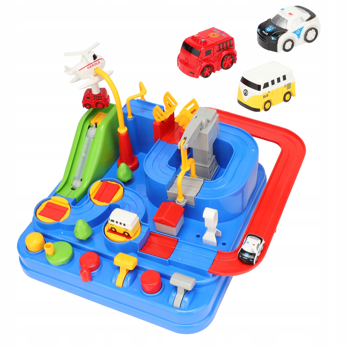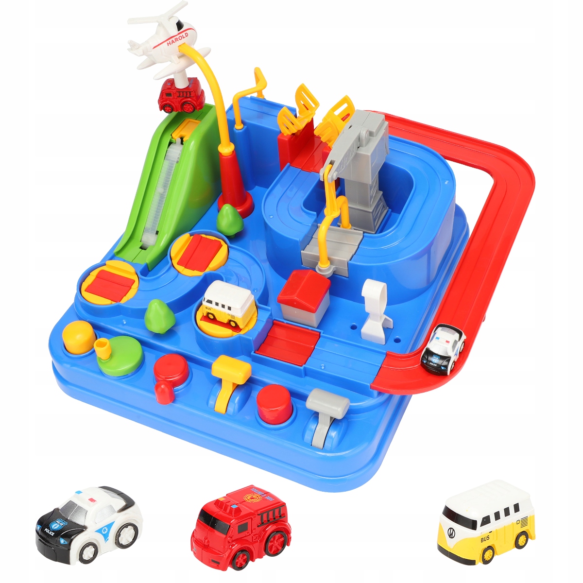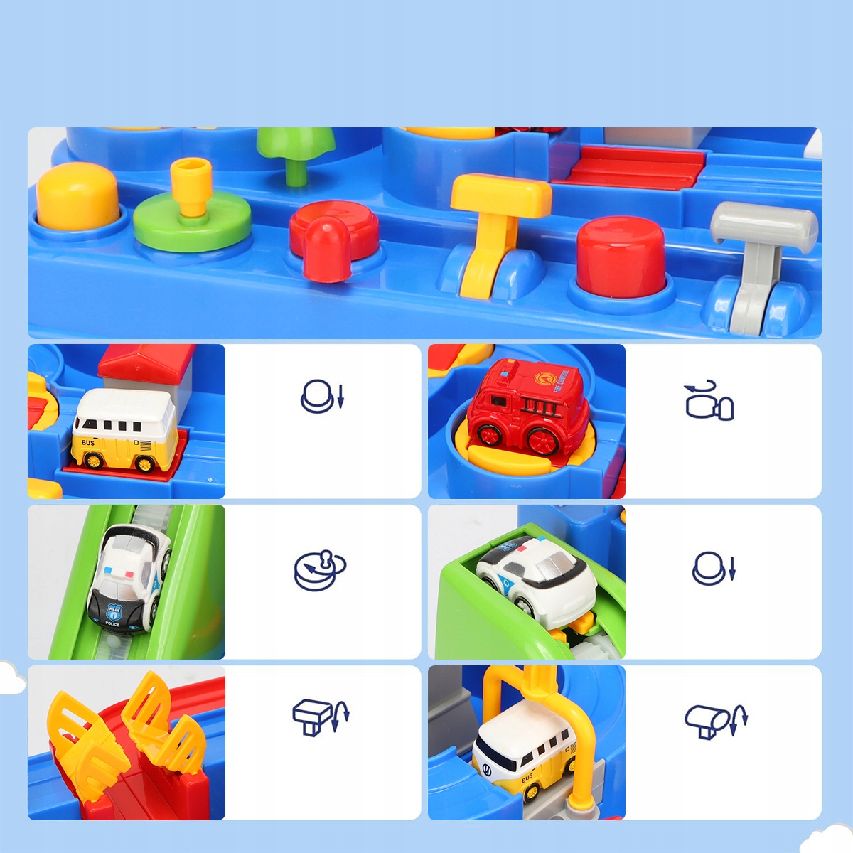 Автомобіль має 6 кнопок для керування та виконання 8 різних завдань, що допомагає дітям вивчати причинно-наслідкові зв’язки. Вбудоване механічне з'єднання, інерційна доріжка, батарейки не потрібні. Набір містить 3 випадково вибрані (унікальні) міні-транспортні засоби (поліцейська машина, швидка допомога, пожежна машина, автобус, таксі тощо), якими діти можуть грати разом.