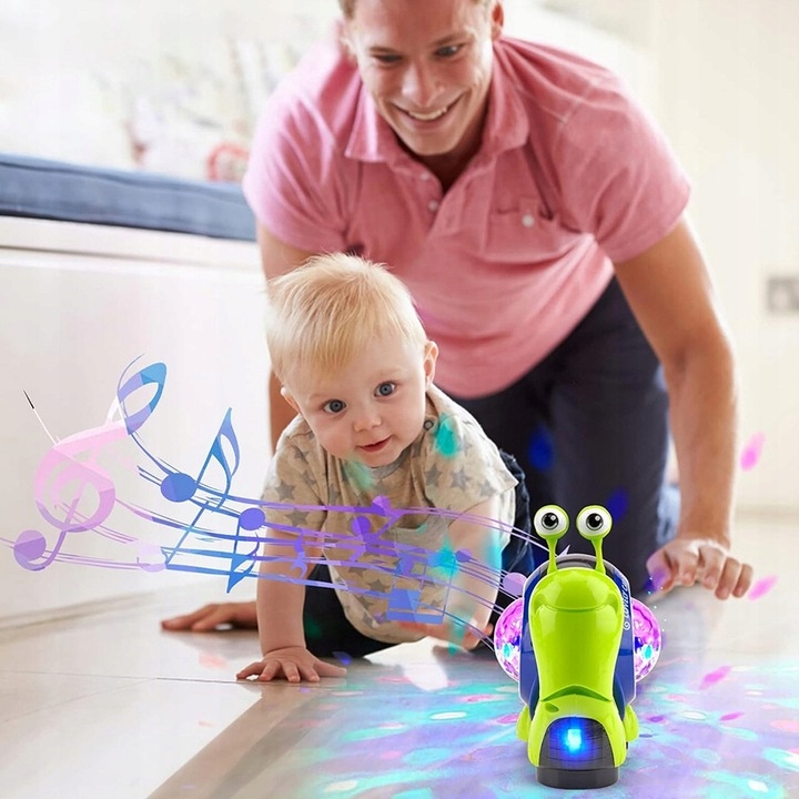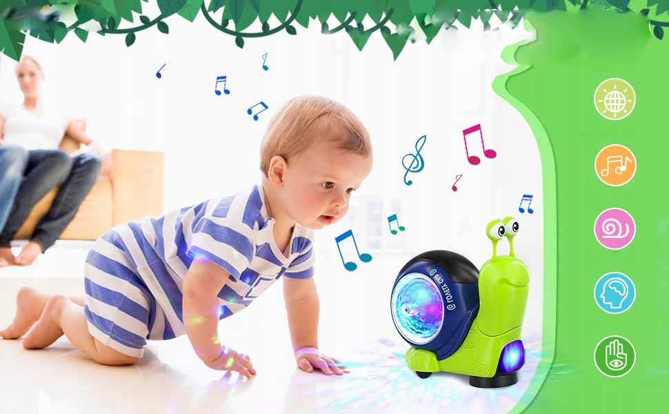 Ця дитяча іграшка-равлик має милий дизайн у формі равлика з веселою музикою, коли равлик качає головою під час повзання, що приверне увагу вашої дитини та спонукає її повзати за вами.