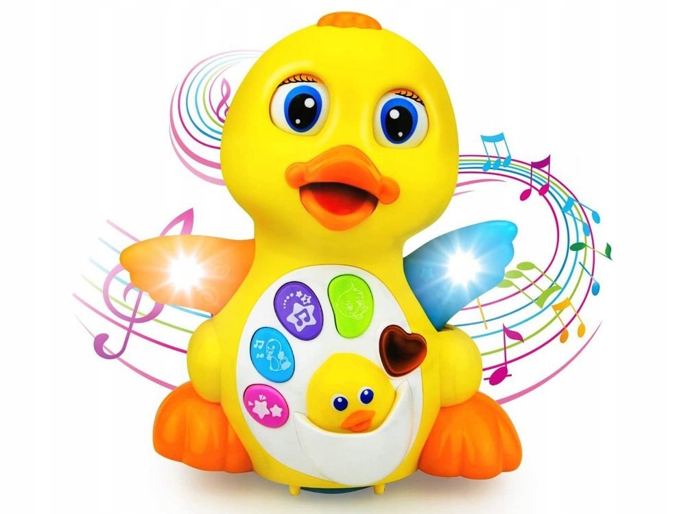 Кнопка запуску іграшки знаходиться в верхній частині голови качки. барвистих мелодій, що ділиться щасливо і повертають очі. З нотатками - Веселі мелодії