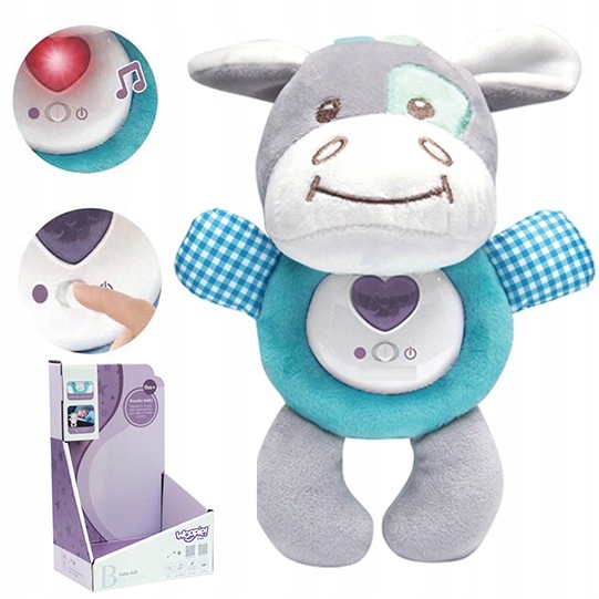 Інтерактивний плюшевий ослик заспокоїть і покладе спати вашу дитину. Іграшка має можливість увімкнути колискову для нашої маленької дитини та має опцію відображення різнокольорових вогників, завдяки чому нашій малечі не буде нудно іграшка. Цей м'який на дотик ведмедик стане другом нашої дитини з раннього віку. Іграшка підходить для немовлят, тому вона м'яка і наповнена ватою, тому нам не потрібно хвилюватися, що наша дитина з нею щось зробить. Крім того, плюшевого ведмедика можна безпечно та легко почистити (знімаючи механізм), не боячись будь-яких пошкоджень.