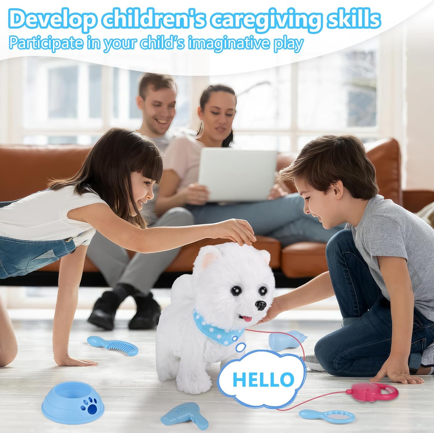 Коли ви її вмикаєте, іграшка починає рухатися, виляти хвостом і видавати реалістичні звуки гавкання 🐕 Завдяки пульту дистанційного керування ви можете виводити собаку на прогулянку, вчити її трюкам або дозволяти їй гуляти. кімната окремо.