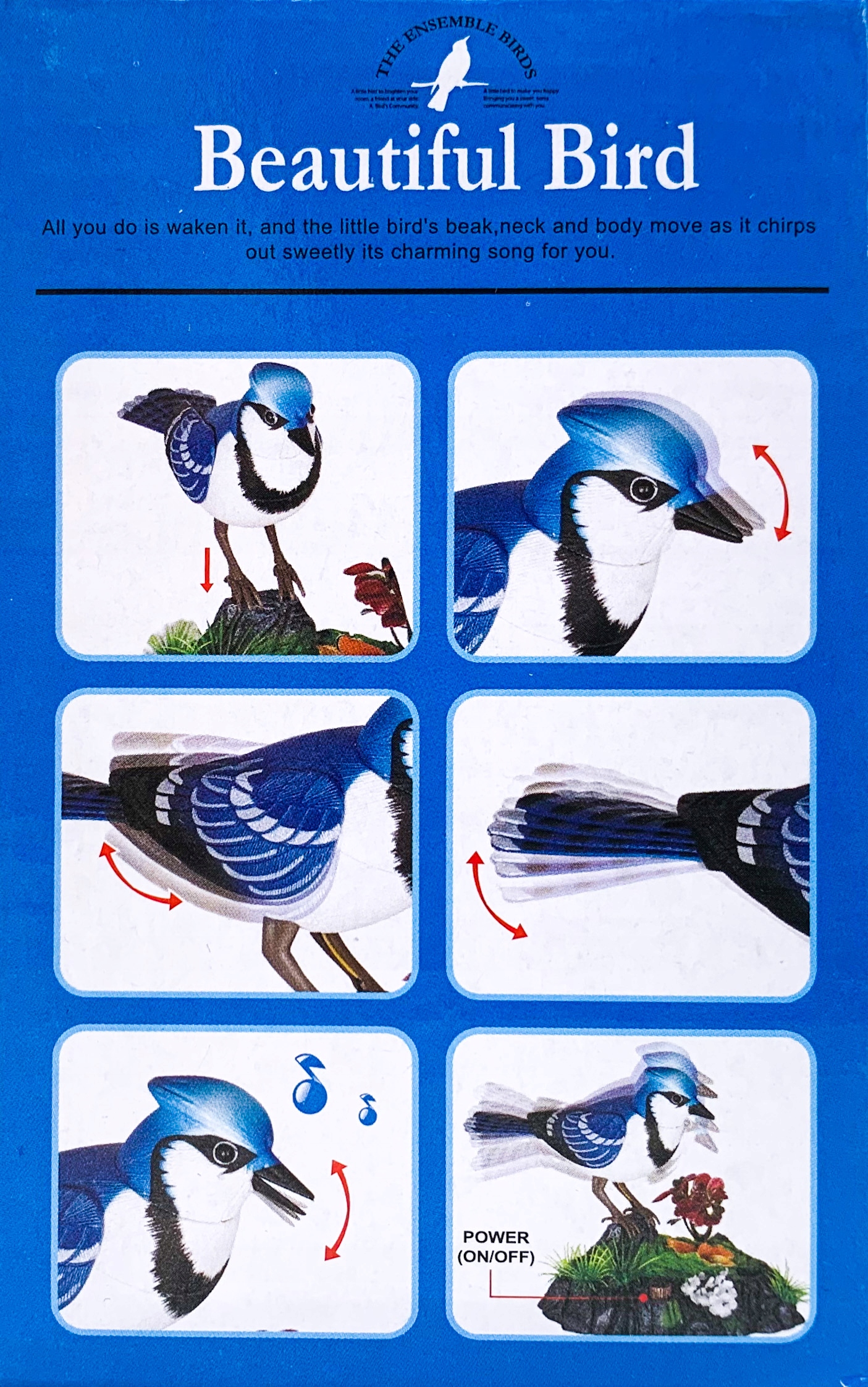 Реагує на дотик і звук. Просто поплескайте або торкніться, і кімната наповниться гарним пташиним співом. Пташка гойдається вперед і назад рухаючи дзьобом і хвостом.