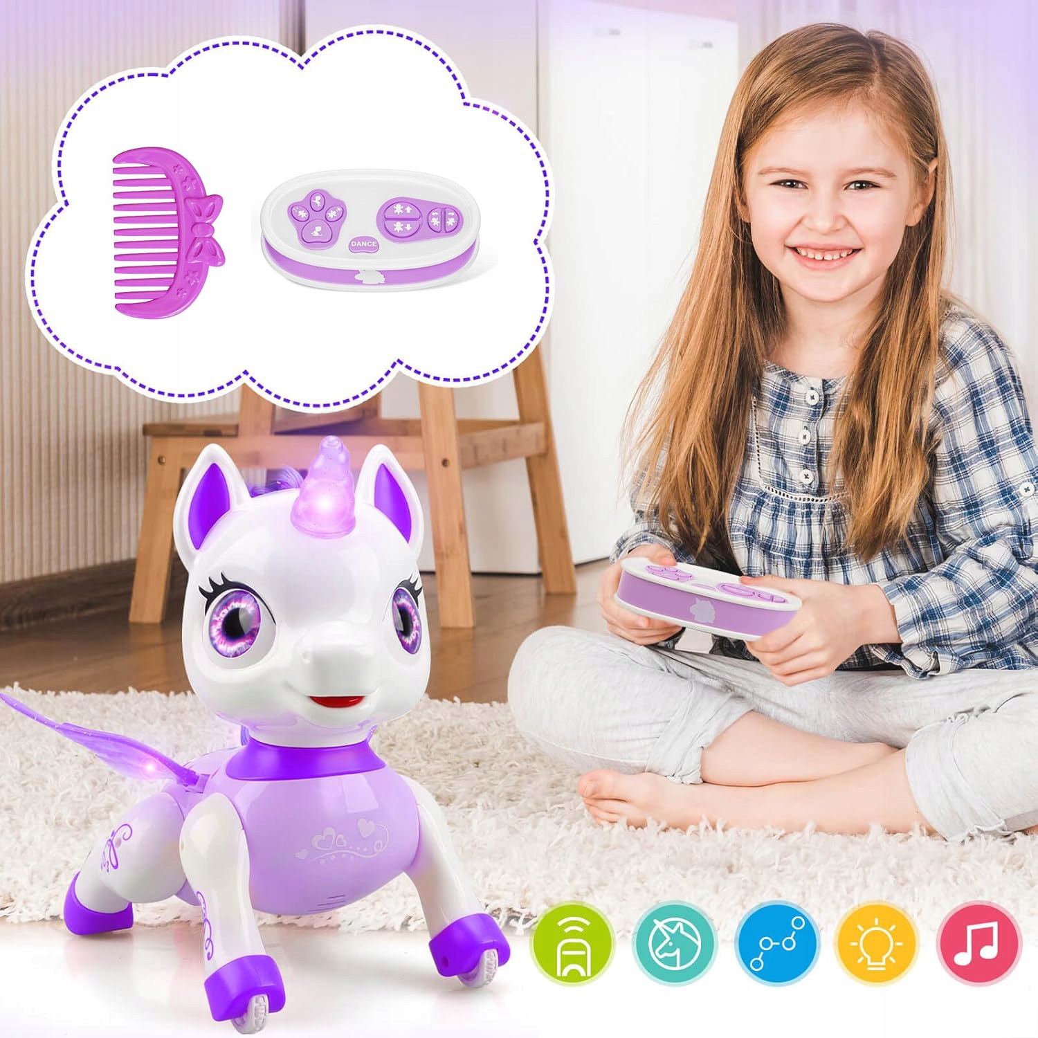 ковзання, біг, обертання, сидіння, стоїть і танцюйте - все після натискання однієї кнопки. Єдиноріг також буде грати чарівну музику, яка диверсифікує інтерактивний досвід.