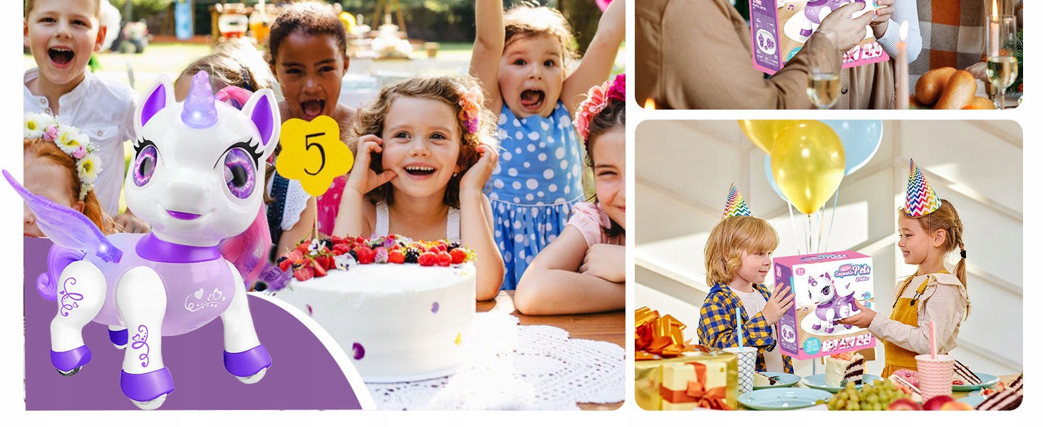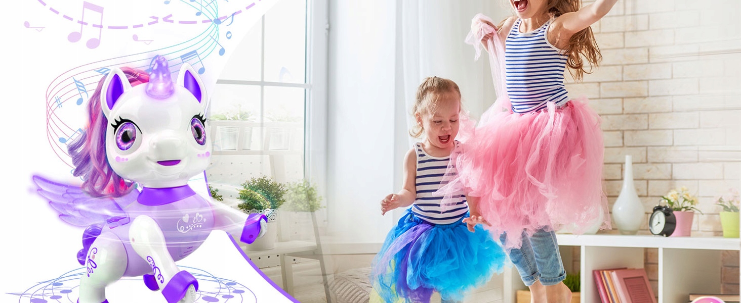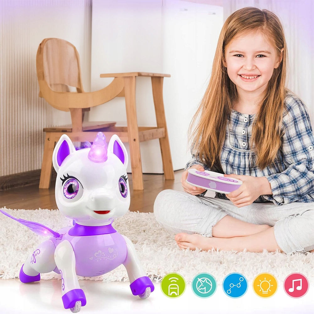 Цей фіолетовий електричний та дистанційний контрольований іграшок-одиниці для дівчат має чарівний дизайн із блискучим куточком та великими крилами єдинорога. Він робить багато кумедних рухів, таких як ковзання, біг, обертання, сидіння, стоячи і танцюють - все на натисканні кнопки. Єдиноріг також відтворює чарівну музику, яка збагачує інтерактивний досвід.