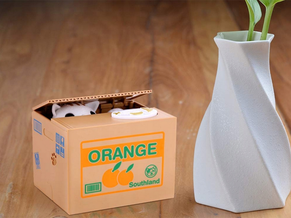- ✅ Кришка коробки відкриється, кошеня візьме лапкою монетку з тарілки всередині коробки.