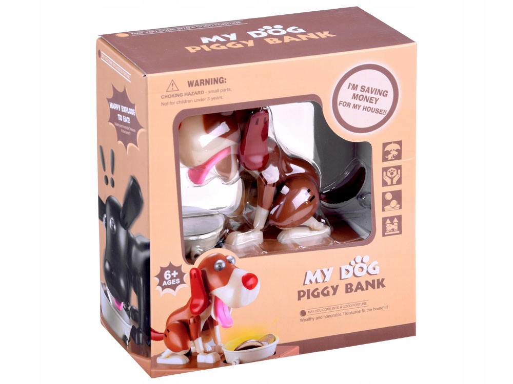 Ми кидаємо монету в миску собаки, яка знаходиться перед ним, потім при дотику собака починає рухатися, ніби він їли їжу з миски, в результаті чого монета впала в скарбничку. Собака кумедно рухається і лопає вухами, їдячи гроші. Для роботи скарбнички потрібні 3 батарейки.