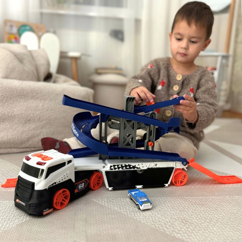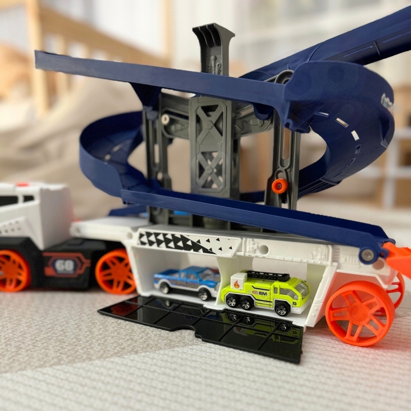✔️Іграшка має додаткову парковку у верхній частині причепа, з якої діти можуть прискорювати машини та вистрибувати з них, що знайомить елемент динаміки та спритності гри.