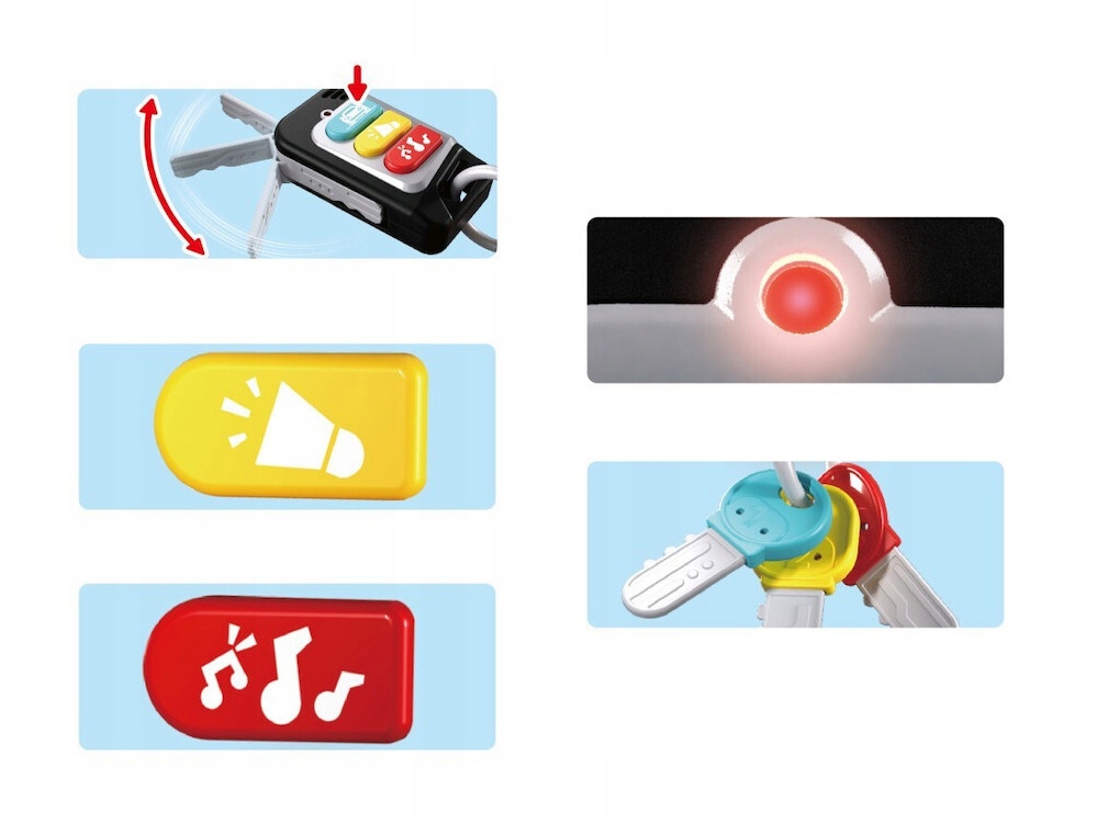 Додатковою атракцією є три закріплені клавіші, , що відповідають кольорам до кнопок на пульті дистанційного керування. Кожен з них має різну форму, що полегшує дитині розрізняти предмети та розвивати сприйнятливість. Набір також включає один висувний ключ , що нагадує справжній автомобіль.