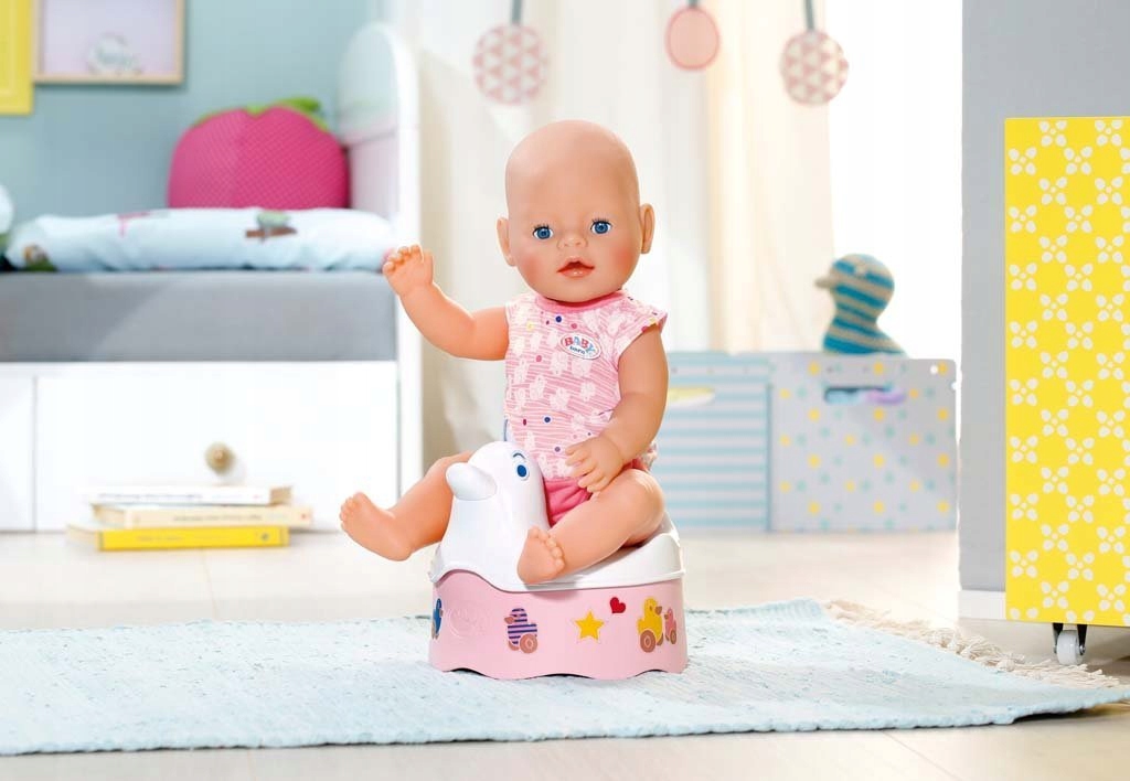 Інтерактивний горщик із наклейками від Zapf Creation. Бебі Борн, як і кожна дитина, пісяє в підгузки. Тепер у неї є унікальний горщик, який спонукає її вперше почати привчати до чистоти. Горщик підходить для ляльок з максимальним зростом 43 см.