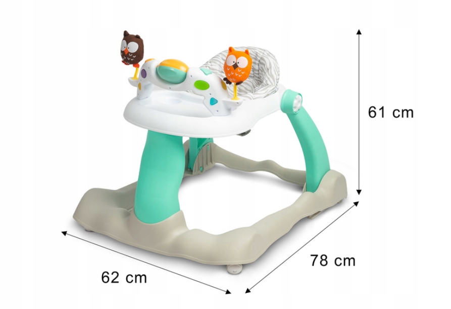 Сови - це дитячий ходок, створений для активних та цікавих світів. Уокер надає підтримку в навчанні зробити перші кроки, заохочуючи дитину грати. Характерні плюшеві сови, безумовно, сподобаються маленьким малюкам, привертаючи їх увагу. Крім того, на панелі Walker є великі барвисті кнопки, які активують 8 різних мелодії. Сови були оснащені функцією зміни висоти сидіння, яка може бути на 22 см або 27 см над землею, адаптуючись до поточної висоти дитини. Уокер був виготовлений з високоякісних матеріалів, які гарантують довговічність та безпеку використання.