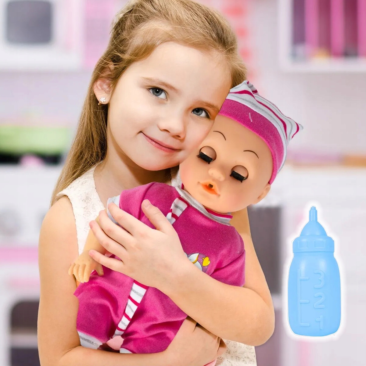 Красива лялька часто буде голодна, як дитина. У комплект входить пляшечка для годування! Але ви також повинні бути обережні, тому що лялька буде писати під час годування - як і личить дитині!