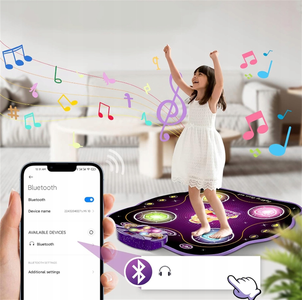 Цей підсвічуваний танцювальний килимок підтримує технологію Bluetooth. Просто під’єднайте його до телефону чи іншого пристрою з підтримкою Bluetooth.