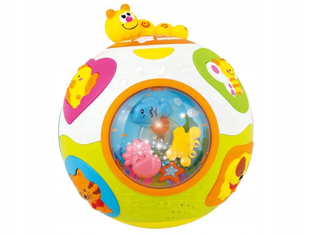 Барвистий повзаючий м’яч, який дозволяє дітям вправляти свої чуття, використовуючи різні мелодії та звуки. Під кожною кнопкою прихована весела мелодія, а при натисканні на зображення тварин лунає відповідний звук.